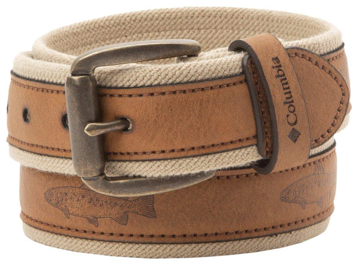 Keep each adventure going strong with this belt by Columbia. This belt features a cotton blend fabric for a comfortable wear, a leather inlay with coastal fish detail, and a stretch fit of up to 2 inches.