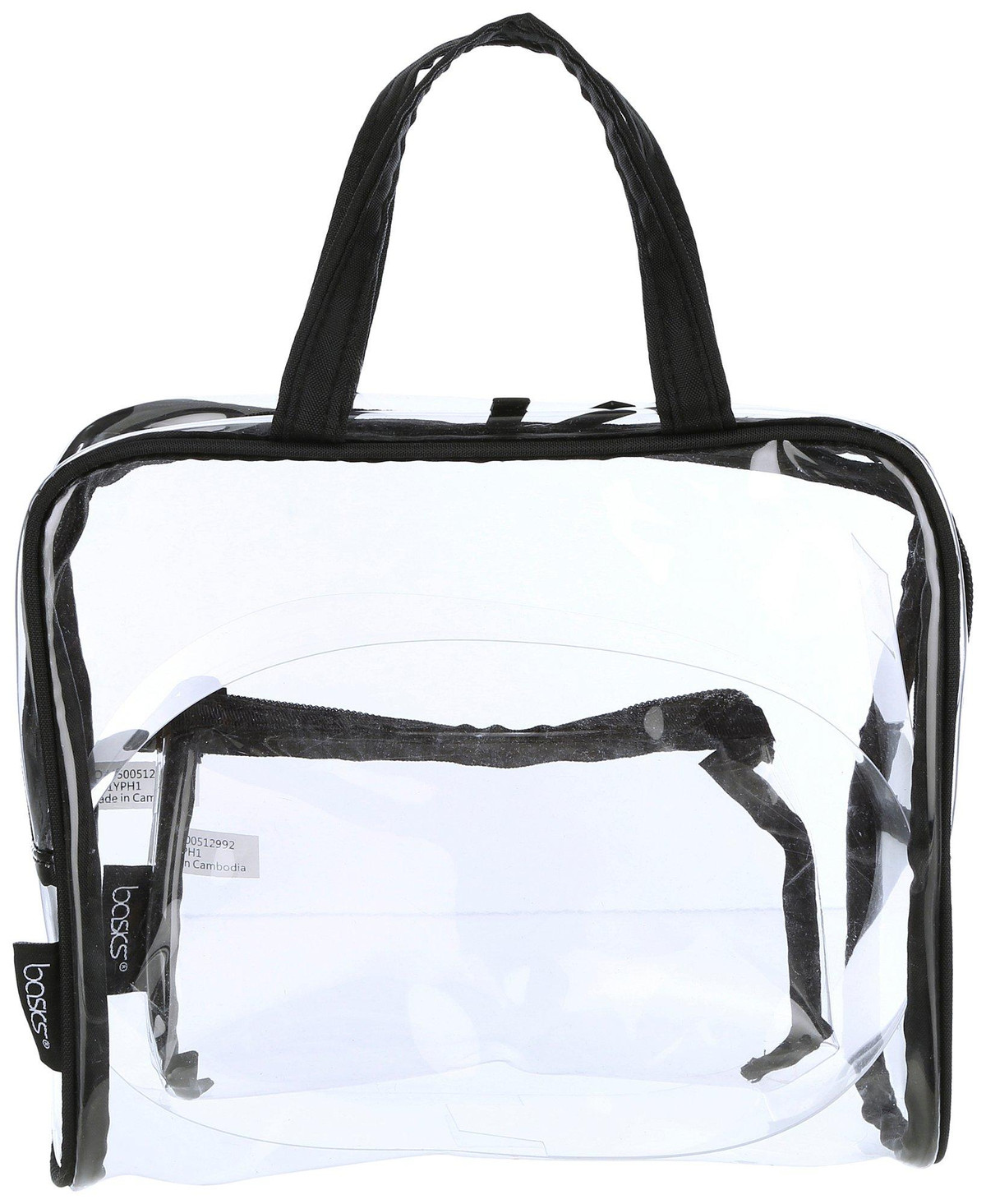 This 2-piece soft-sided case set features a clear vinyl construction with solid color trim and zipper top closure. The larger bag has dual strap handles. Water resistant. Suitable for organizing jewelry, cosmetics, toiletries, cables and wires, or travel bottles at home or on-the-go. Large bag measures approximately 9 in L. x 3 in. W x 8 in. H.