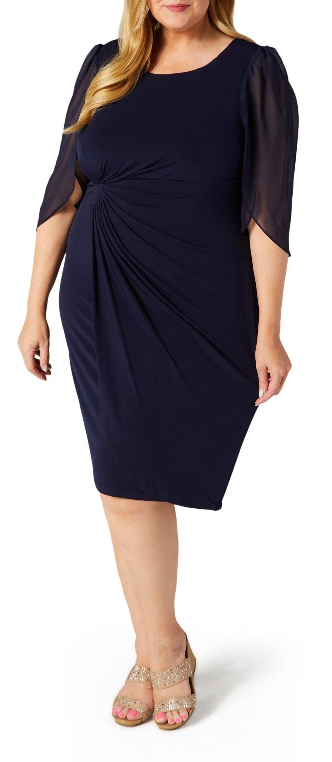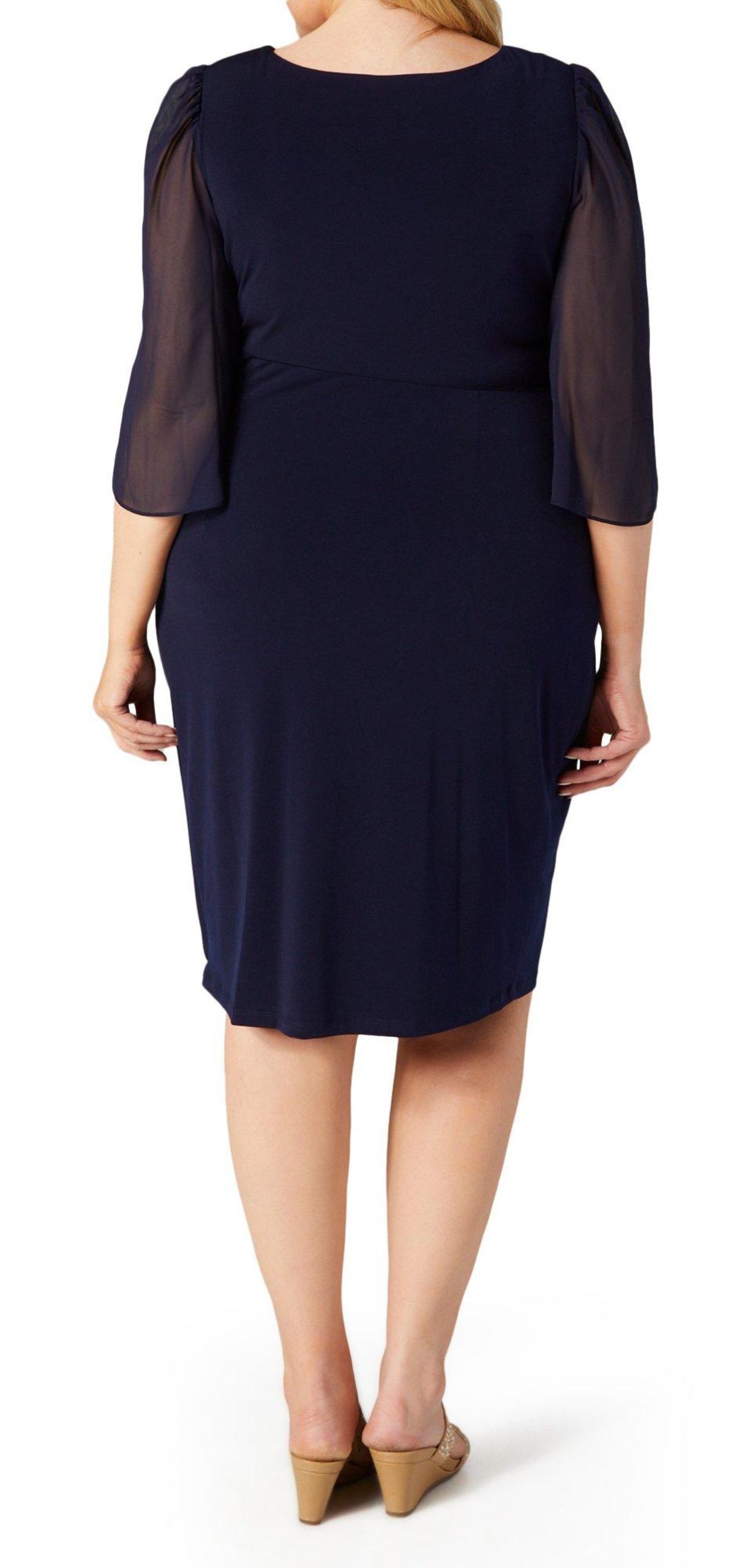 Embrace effortless elegance with this 3/4 Sleeve Dress. Crafted from delicate chiffon fabric, this knee-length dress is fully lined for a comfortable fit. The flowing silhouette and airy material create a graceful movement with every step. Perfect for both daytime events and evening occasions, this dress offers a sophisticated look that is both timeless and versatile. Pair it with your favorite accessories to complete the ensemble. Fabrication is 96% polyester, 4% spandex.
