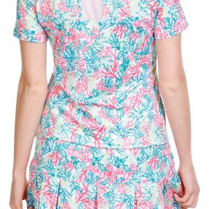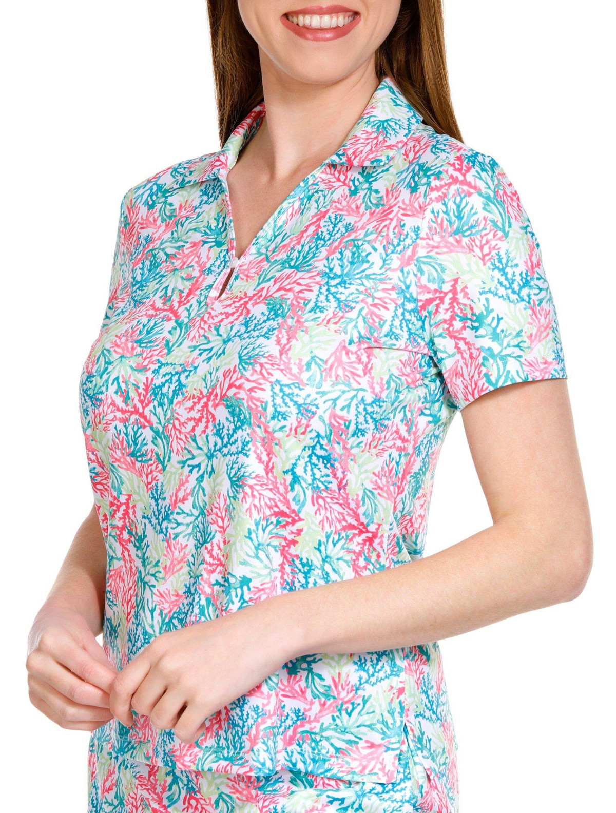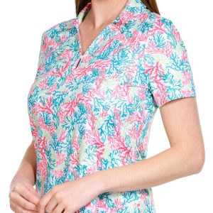 This Golf Women’s Coral Print 1/4 Zip Polo Shirt is made from a blend of 92% polyester and 8% spandex, offering a comfortable, stretchy fit that moves with your swing. The vibrant coral print adds a fresh, stylish touch, while the 1/4 zip design allows for adjustable ventilation. Perfect for a day on the course or casual outdoor activities, this polo combines performance with a chic, eye-catching design. Top length is approximately 26 inches.