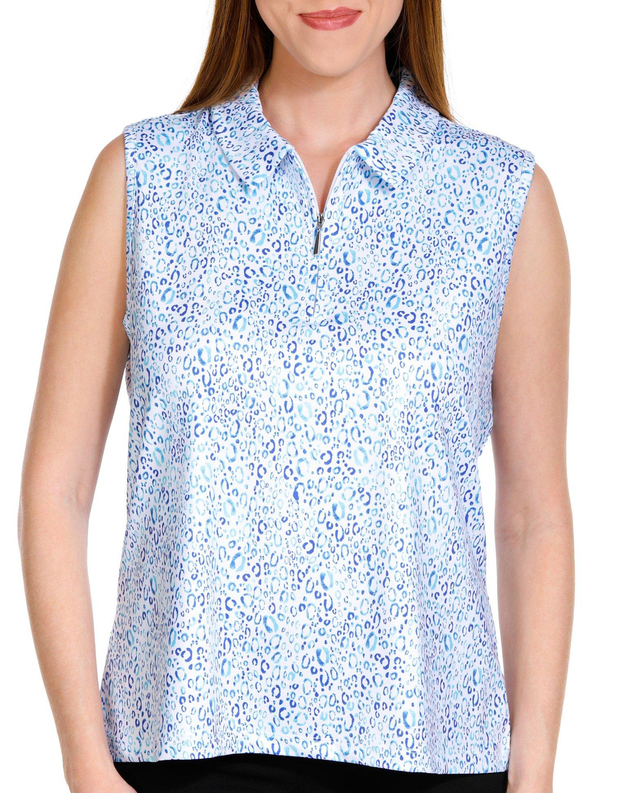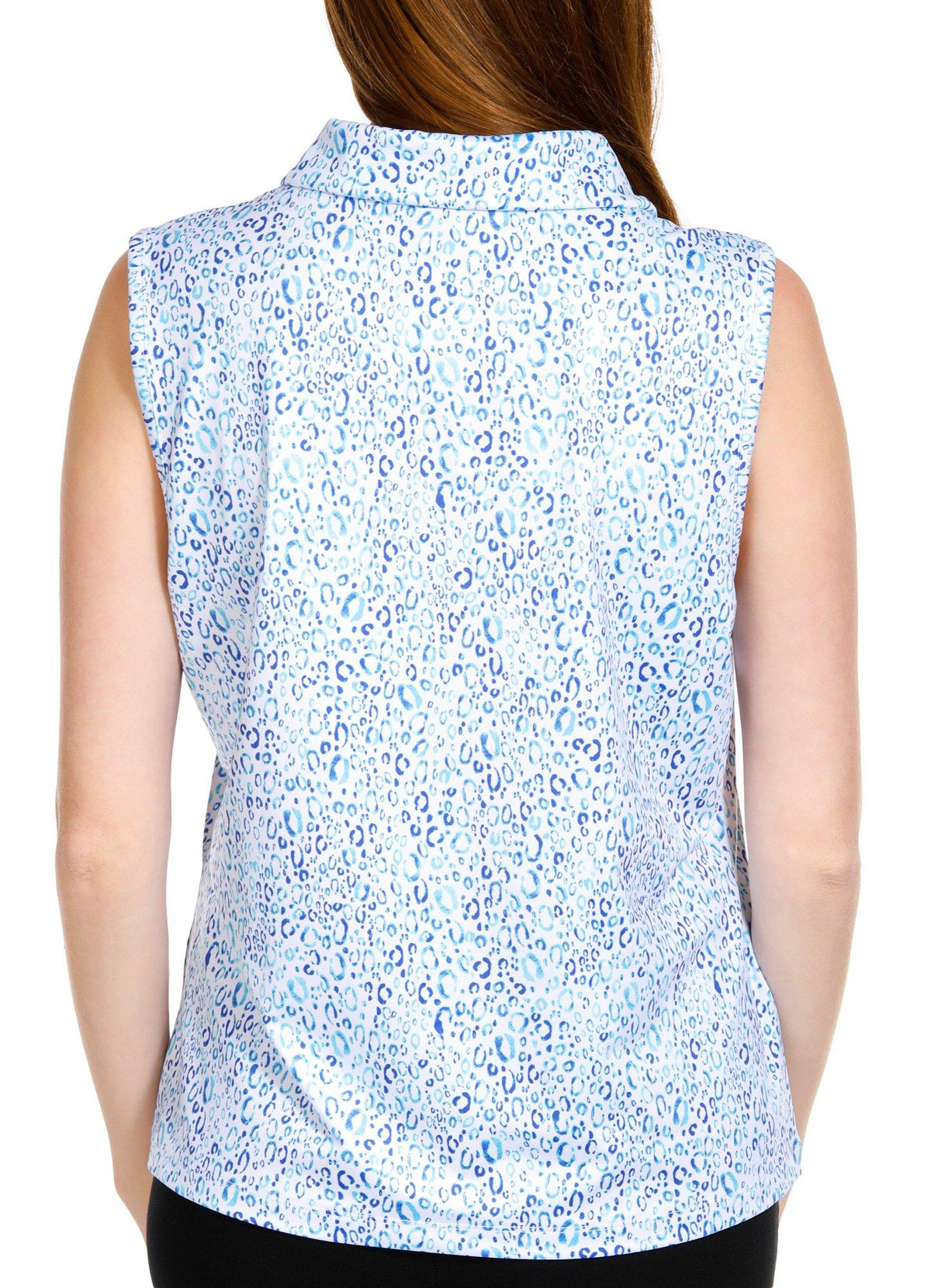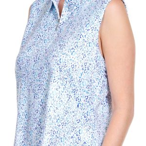 This sleeveless top features a sleek collar and a flattering v-neckline, adorned with a chic printed design that captures the essence of golf and outdoor fashion. Crafted from lightweight stretch knit fabric, it ensures maximum comfort and freedom of movement. Its classic styling is perfect for those who appreciate a blend of tradition and modernity on the green. Get ready to swing in style! Top length is approximately 26 inches. The fabrication is 88% polyester and 12% spandex.
