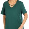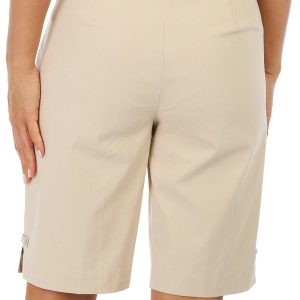 These easy-care shorts feature a solid color design on lightweight comfort stretch fabrication, two front pockets, wide hidden elastic waistband, pull-on styling, and a decorative diamond detail at the side split hem. Inseam measures approximately 12 in. Outseam approximately 23 in. Fabrication 75% rayon, 22% nylon, 3% spandex.