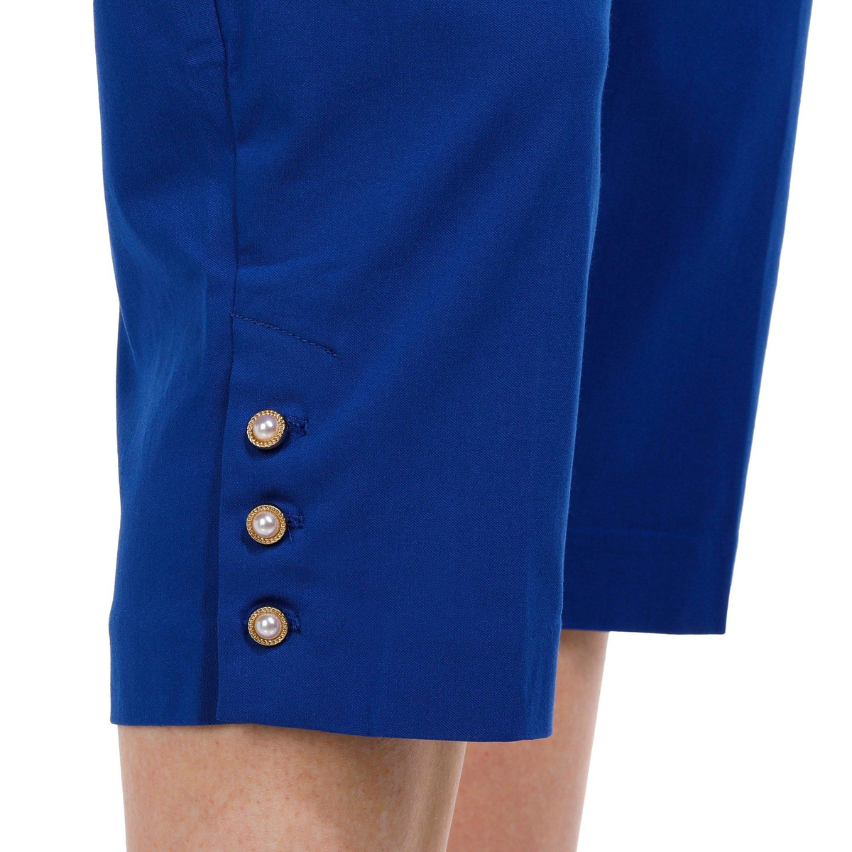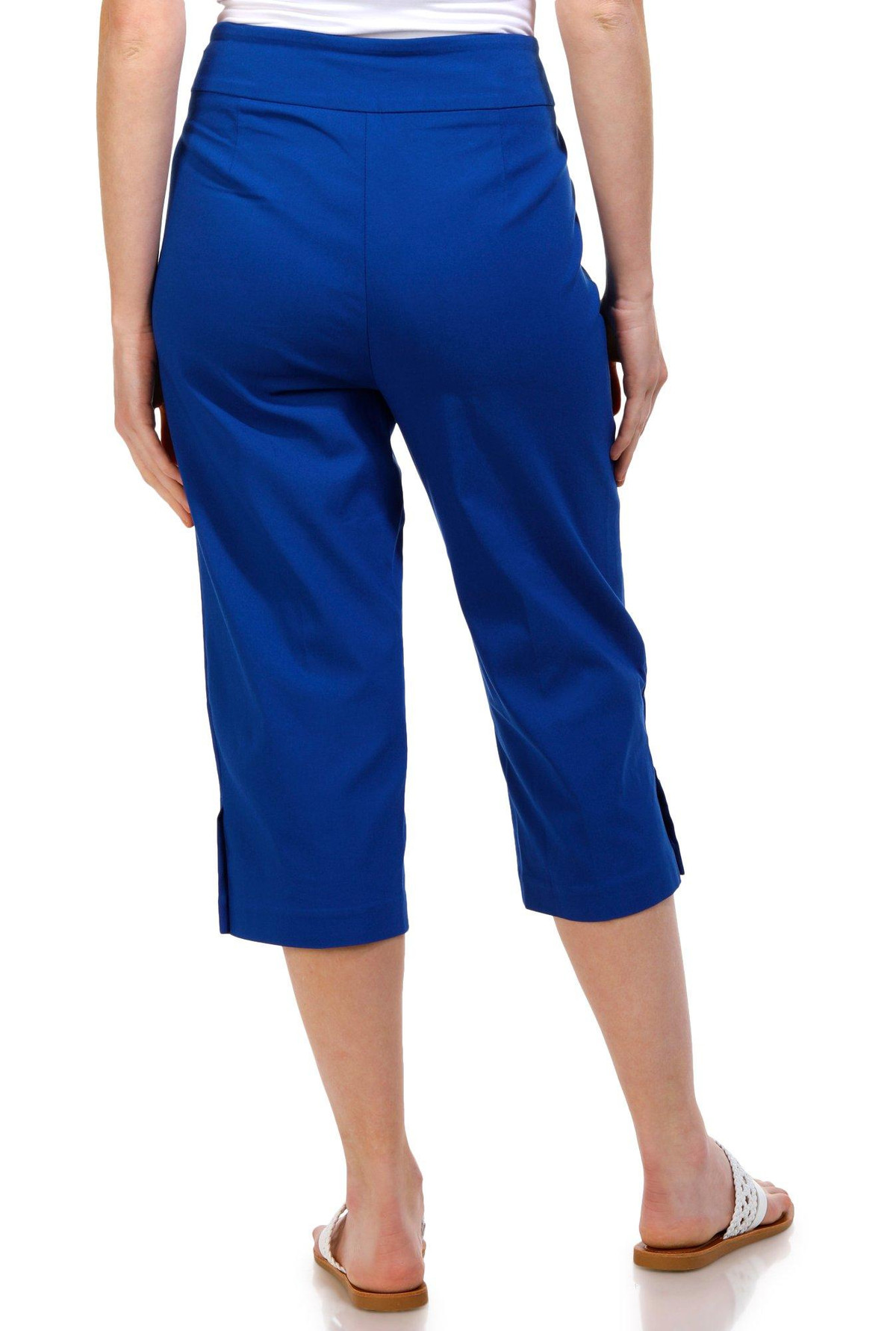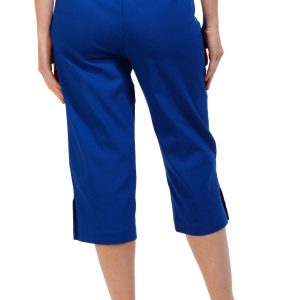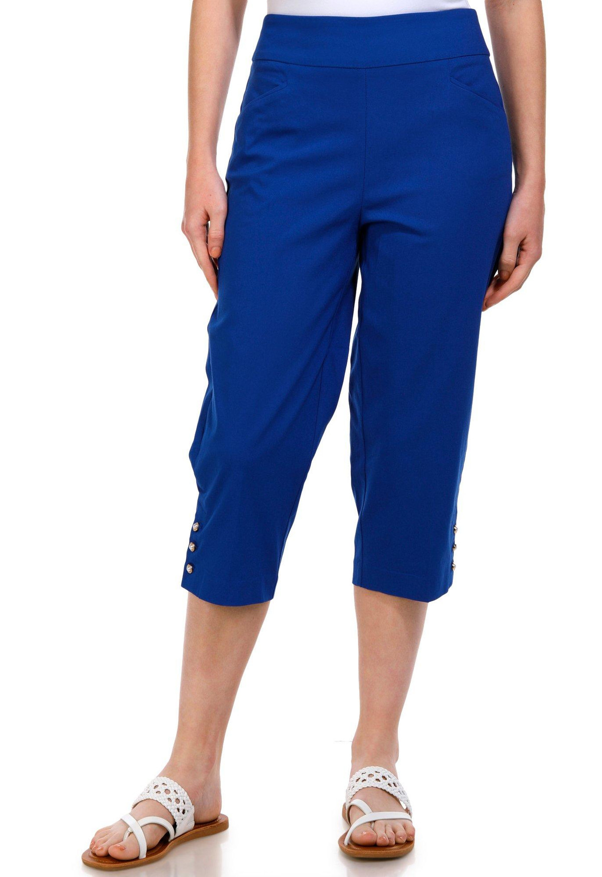 Introducing our Womens Pearl Button Capris Pants, the perfect blend of elegance and comfort. These capris feature a stylish solid color and chic pearl button accents on the hem, adding a touch of sophistication. With convenient side slip pockets and a comfortable pull-on waistband, they are designed for ease and style. Made from a high-quality blend of rayon, nylon, and spandex, these capris offer a flattering fit and lasting comfort. Inseam measures 20 in.