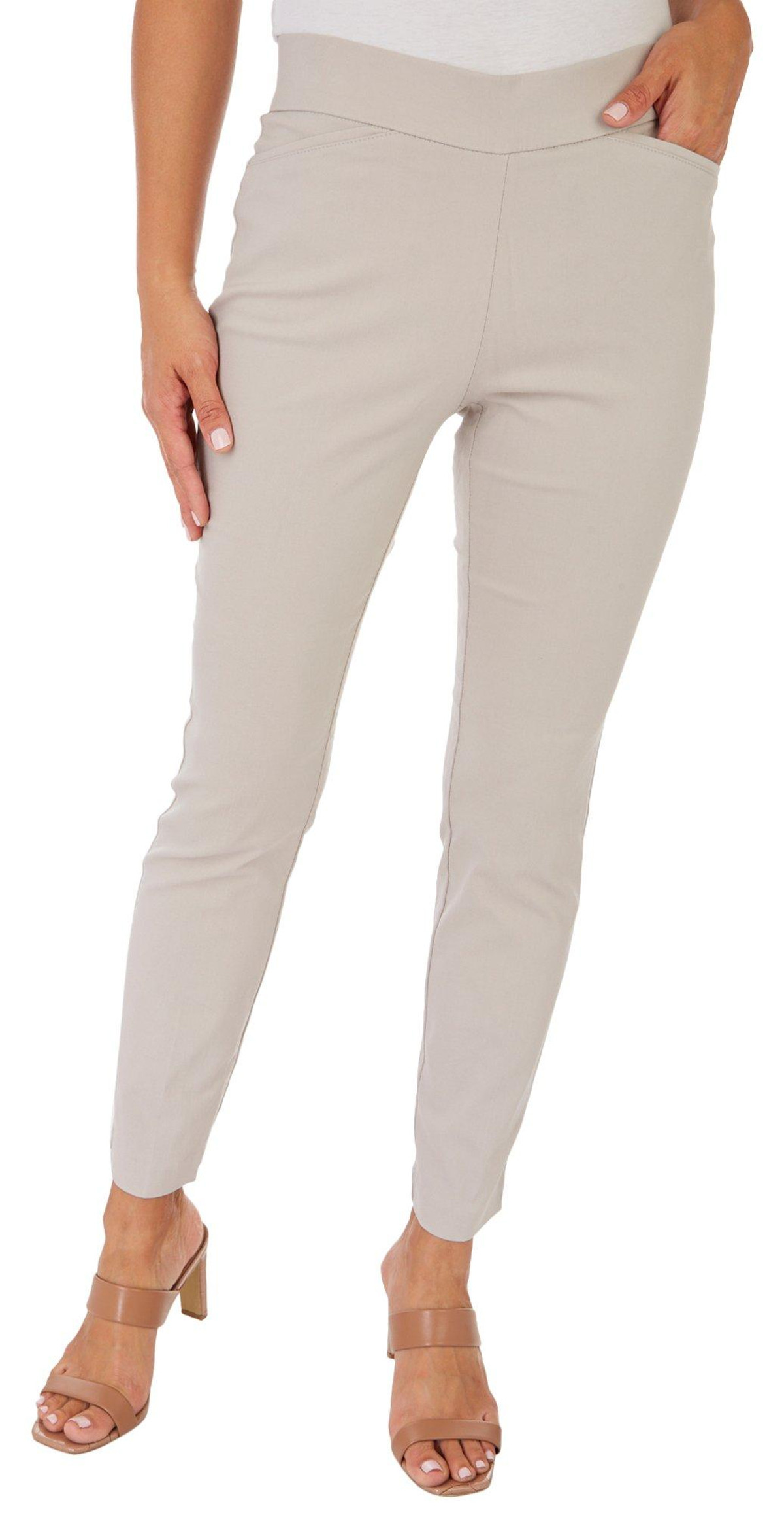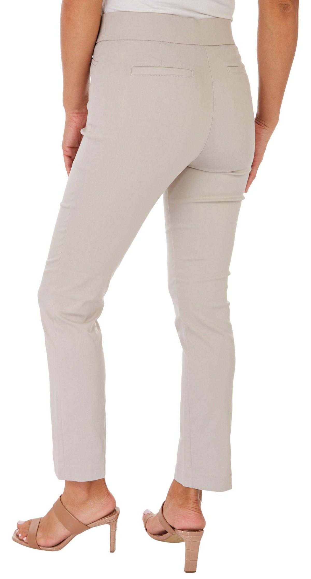 These pull-on pants feature a solid design on lightweight comfort stretch fabric, a hidden elastic waistband for optimal comfort, a slimming tummy panel, two front pockets, two back pockets, and slim fit. Inseam measures approximately 28 inches. Fabrication 75% rayon, 22% nylon, 3% spandex.