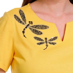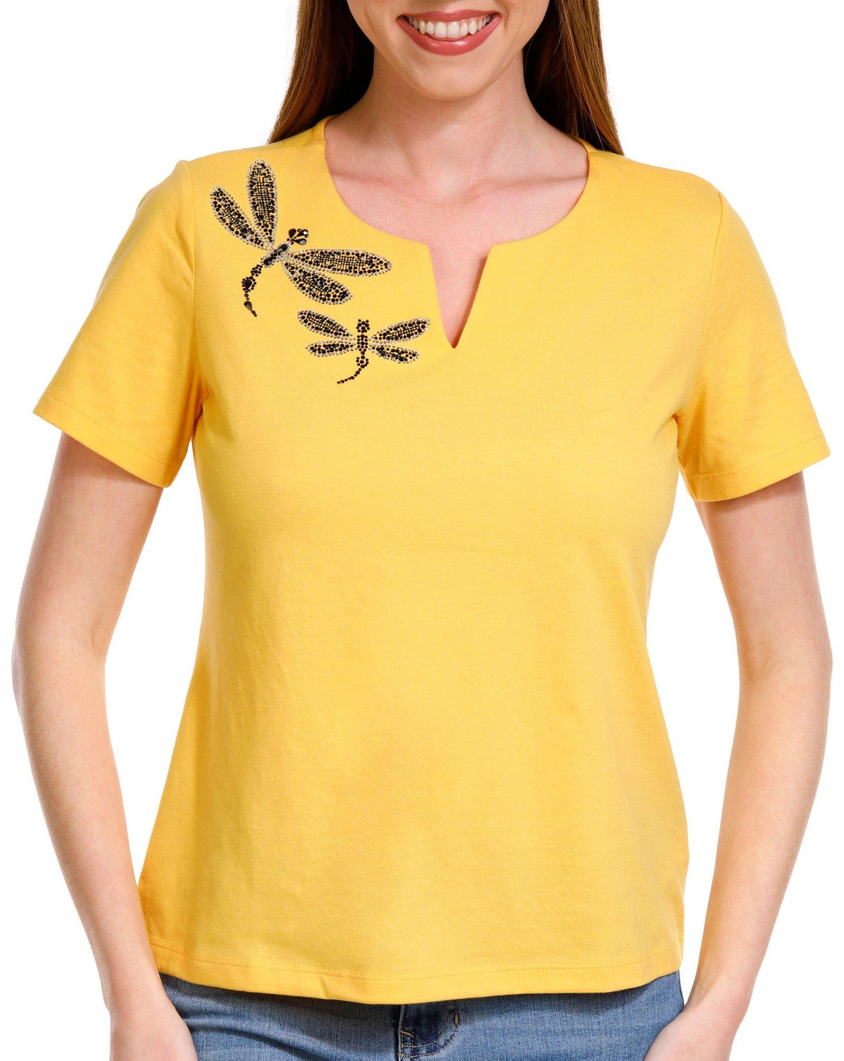 The Petite Dragonfly Solid Short Sleeve Top is a stylish and comfortable addition to your wardrobe. Made from a soft 60% cotton and 40% polyester blend, it offers a breathable, lightweight fit. The solid color design is complemented by a charming dragonfly detail, adding a touch of elegance and whimsy. With a 24-inch length, this top is perfect for casual wear or dressing up for a more polished look.