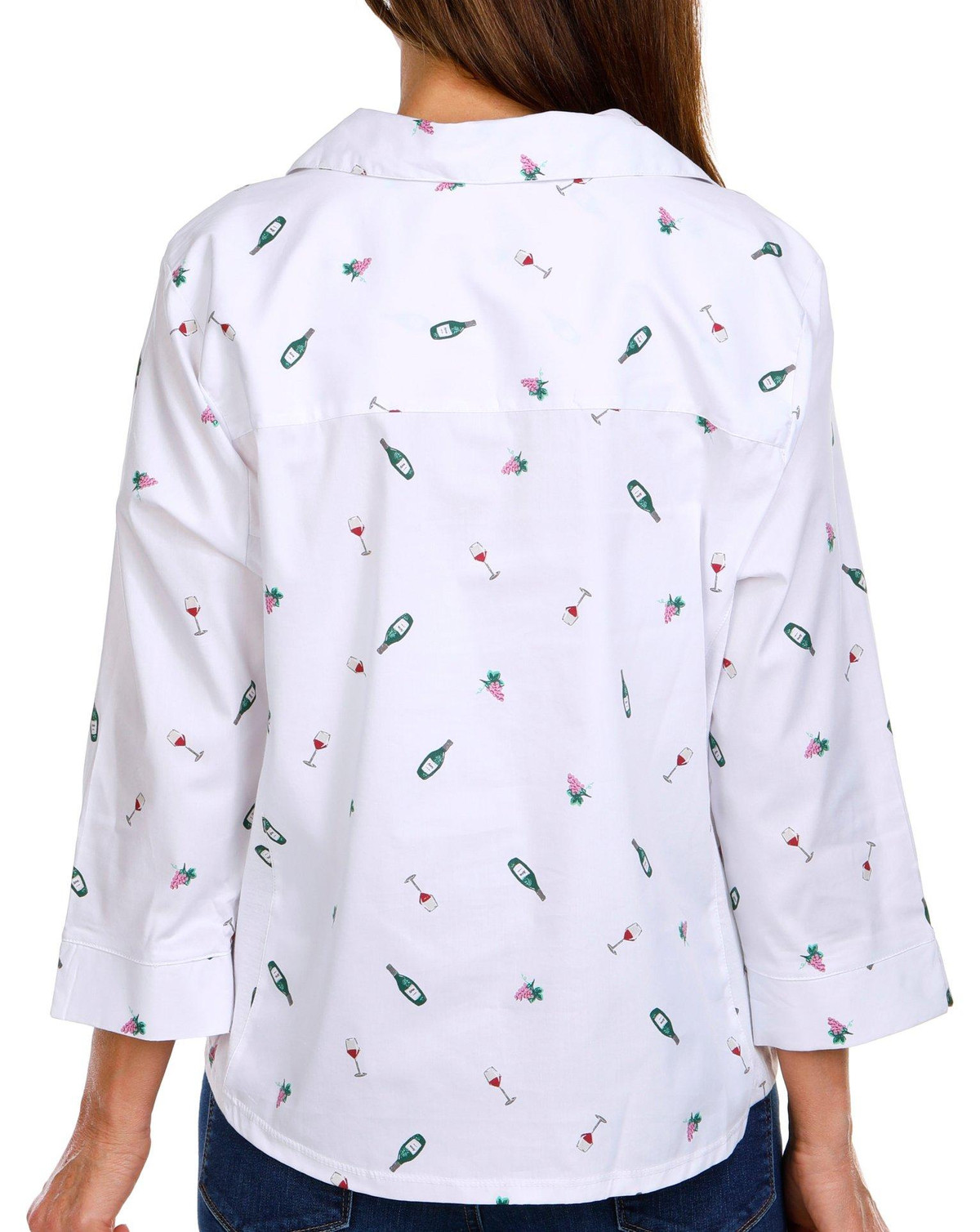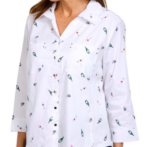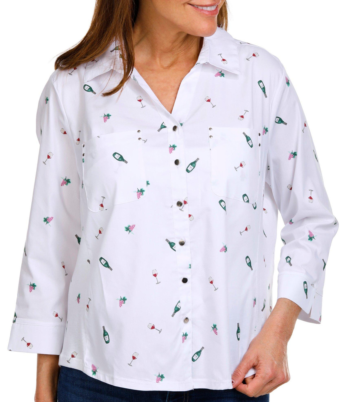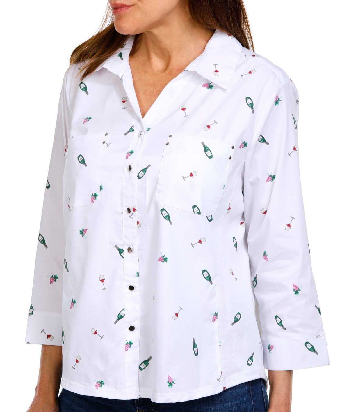 Introducing the Knit-2-Fit Print Button Down Blouse from Coral Bay, a perfect blend of style and comfort. This blouse features a charming print and two chest pockets for added functionality. The 3/4 sleeves offer a versatile look, making it suitable for various occasions. Made from a blend of 67% cotton, 29% polyester, and 4% spandex, it ensures a comfortable and flattering fit.