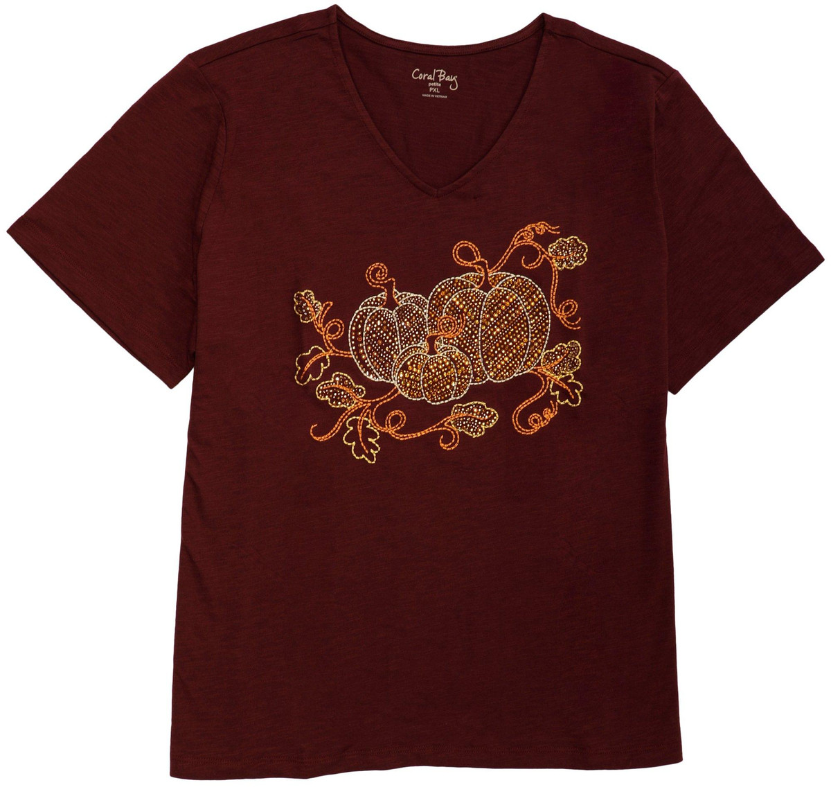 Celebrate the season in style with this petite V neck top featuring festive pumpkin embellishments. Designed for fall flair, it offers a flattering silhouette and cozy comfort perfect for autumn gatherings or casual days out.
