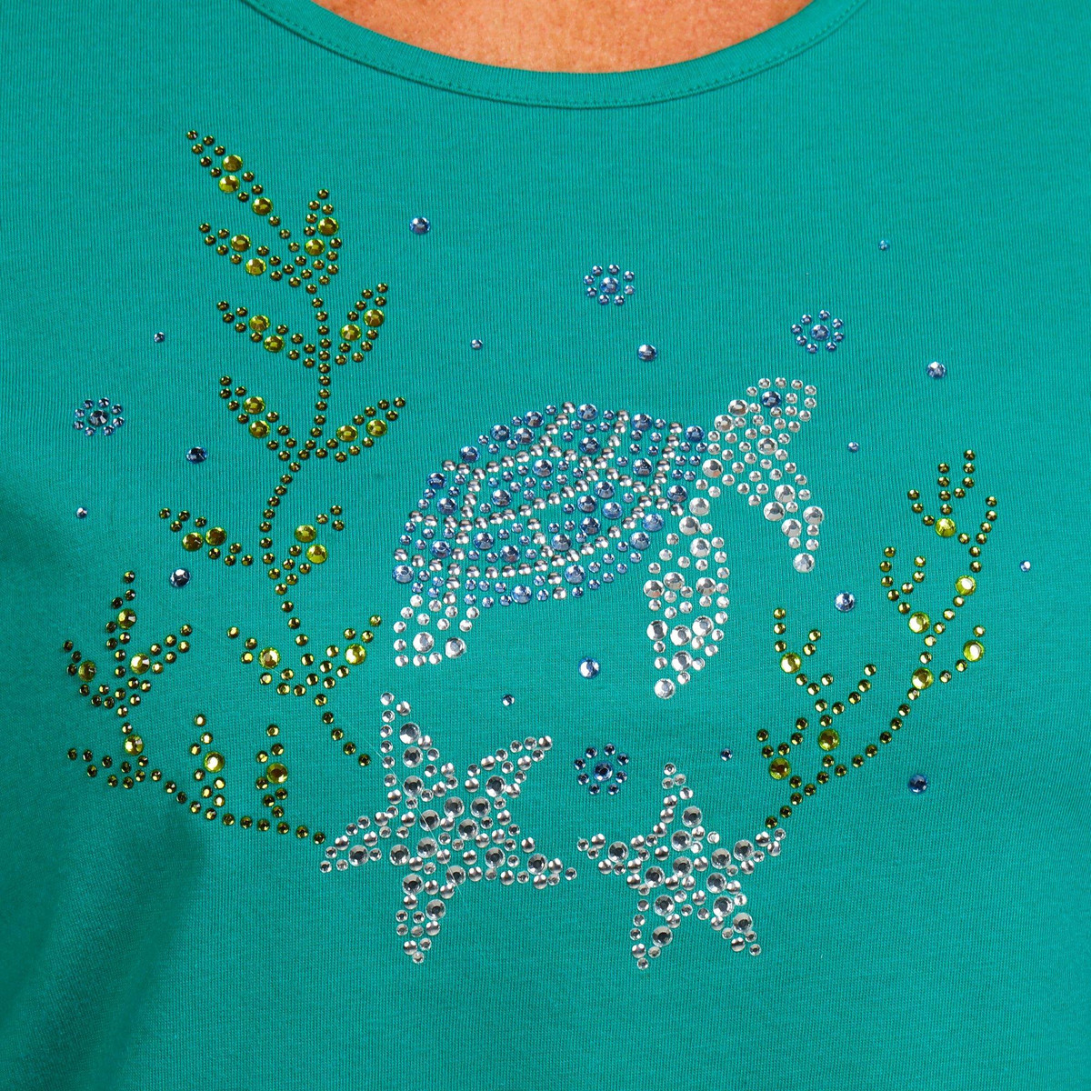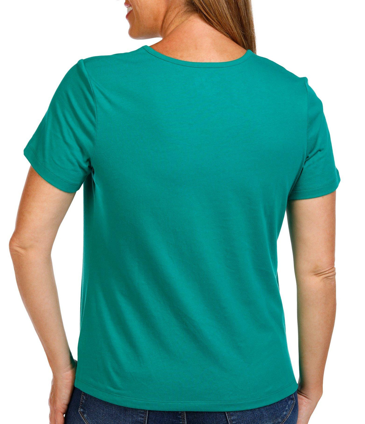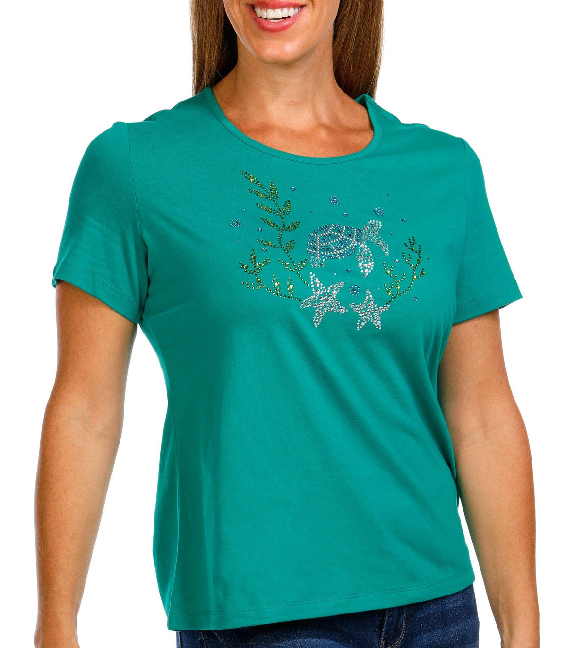 Add a playful sparkle to your look with this Petite Short Sleeve Rhinestone Sea Turtle Top. Featuring a scoop neckline and short sleeves, its adorned with a shimmering rhinestone sea turtle design that brings a touch of coastal charm to your casual wardrobe. Fabrication 60% cotton, 40% polyester