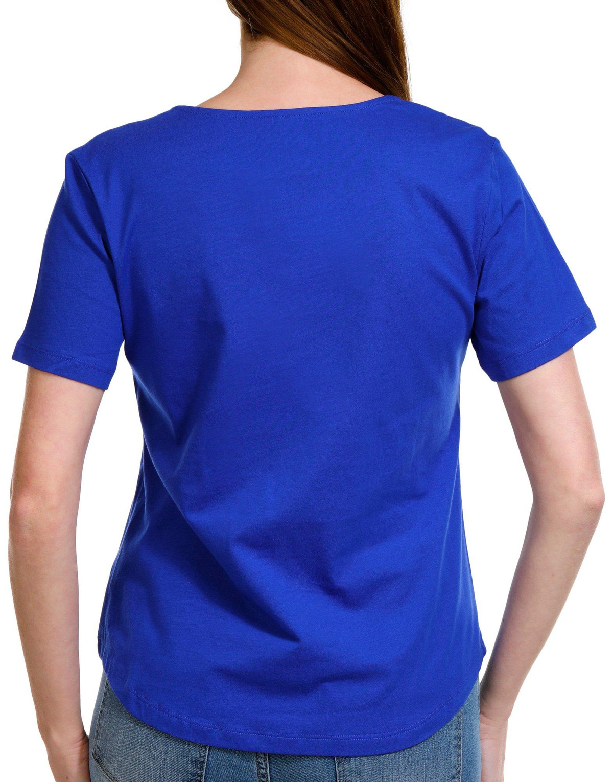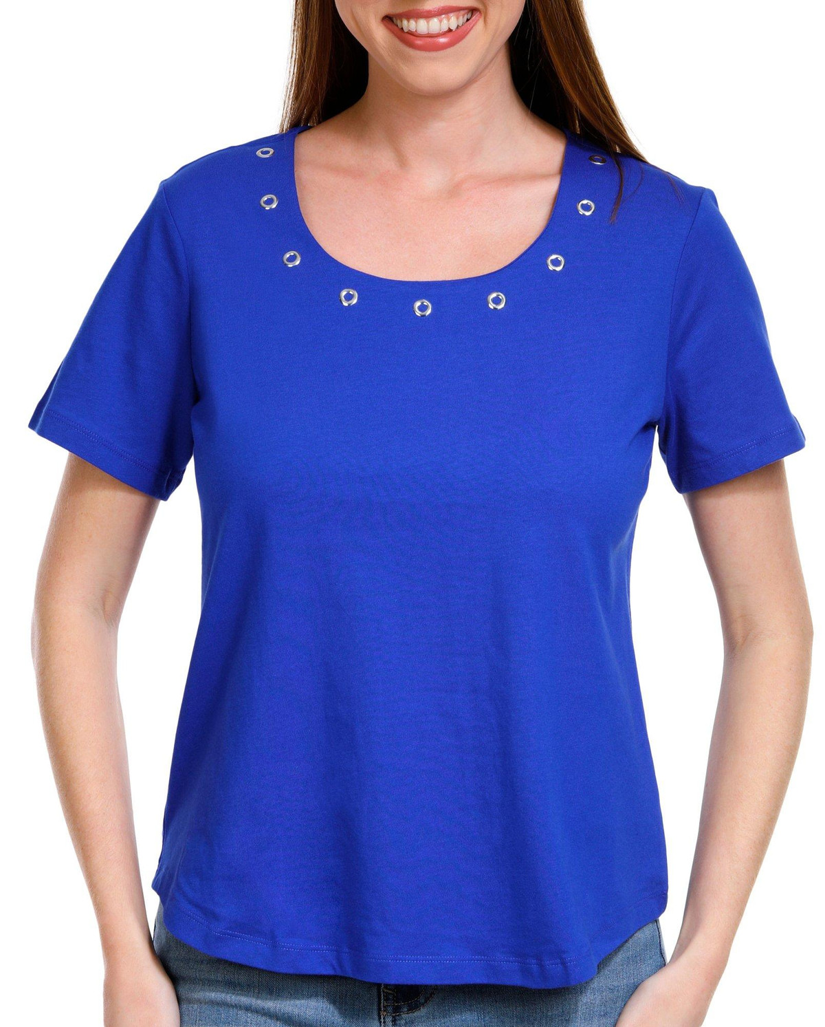 This Short Sleeve Tee with a square neck and grommet details is a stylish and comfortable choice for any casual occasion. Made from soft cotton, this tee offers a cozy feel while ensuring breathability. The unique square neckline, accented with grommet details, adds a modern and edgy touch to the design. Perfect for pairing with your favorite jeans or shorts, this tee effortlessly combines comfort and contemporary style. Top length measures approximately 24 in.