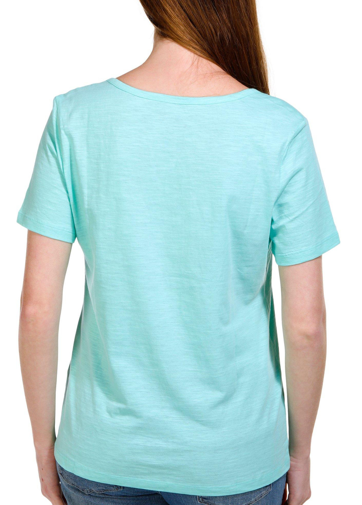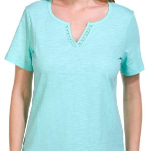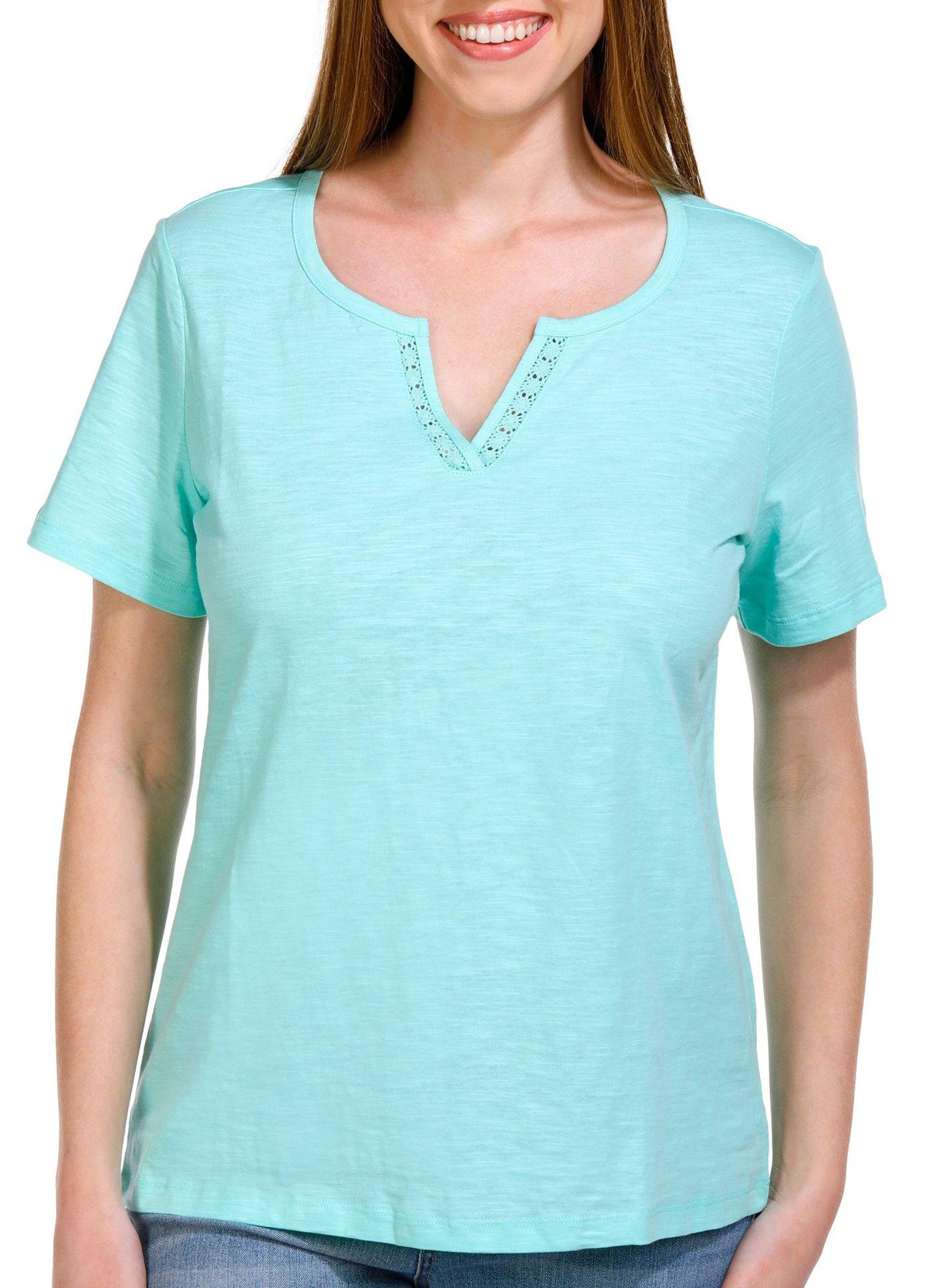 Add a touch of elegance to your wardrobe with this Petite Solid Crochet Split Neck Short Sleeve Top. Made from 100% soft and breathable cotton, this top ensures comfort while keeping you stylish. Featuring a delicate crochet design at the split neckline, it strikes the perfect balance between casual and refined.