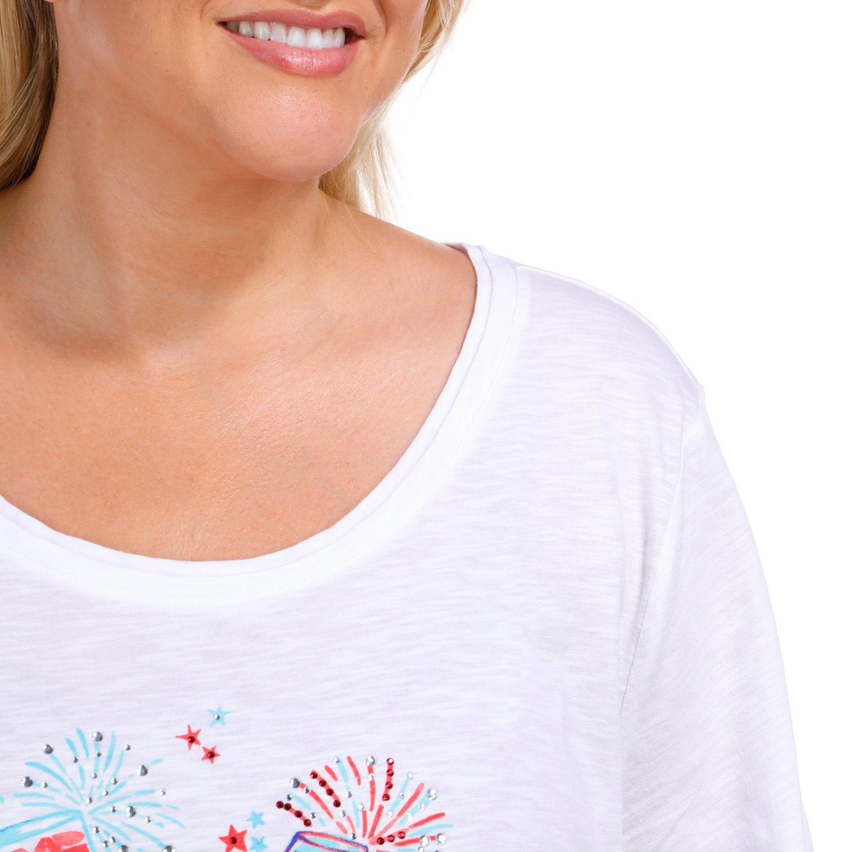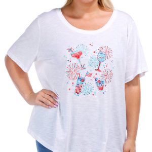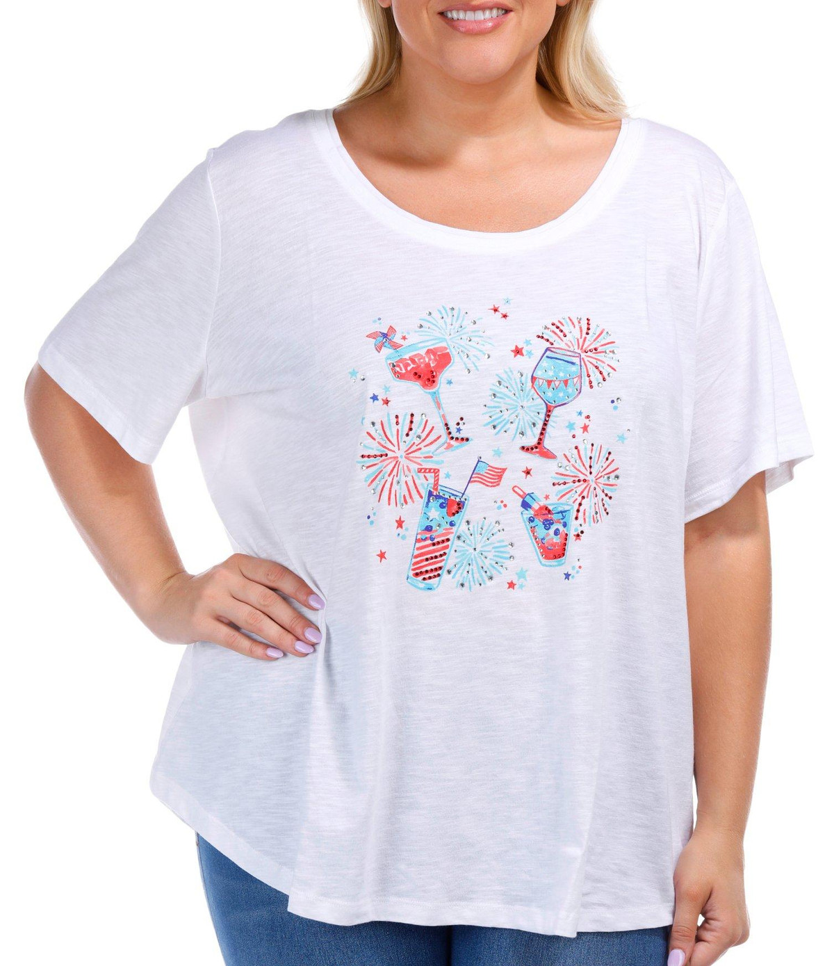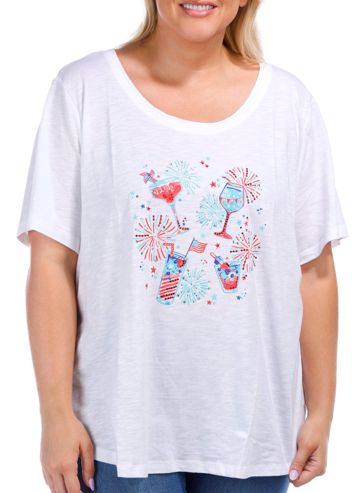 Show your patriotic flair with this Plus Embellished Short Sleeve T-Shirt. Crafted from a soft cotton, it features red, white and blue drink glasses adorned with sparkling rhinestones. The short sleeves and flattering double scoop neckline add comfort and style, perfect for festive summer days. Fabrication is 100% Cotton. Top length measures approximately 29 in.