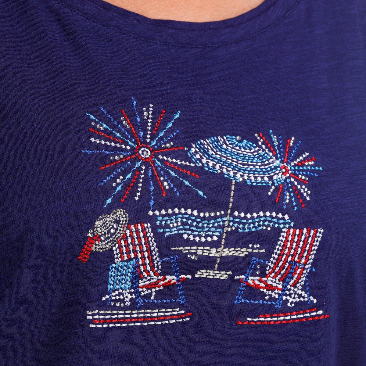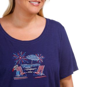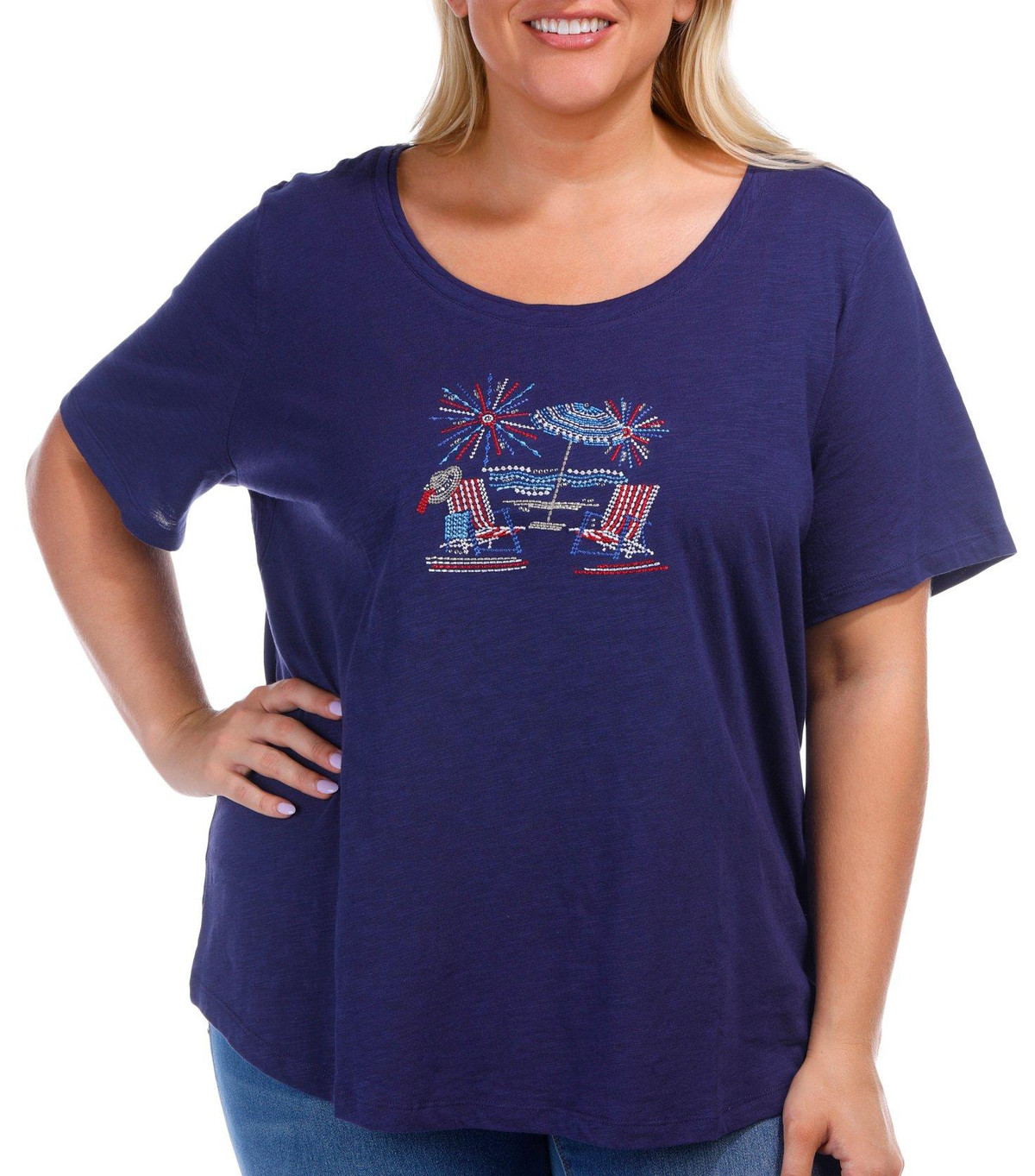 Show your patriotic flair with this Plus Embellished At The Beach Short Sleeve T-Shirt. Crafted from a soft cotton, it features a fireworks at the beach design adorned with sparkling rhinestones. The short sleeves and flattering double scoop neckline add comfort and style, perfect for festive summer days. Fabrication is 100% Cotton. Top length measures approximately 29 in.