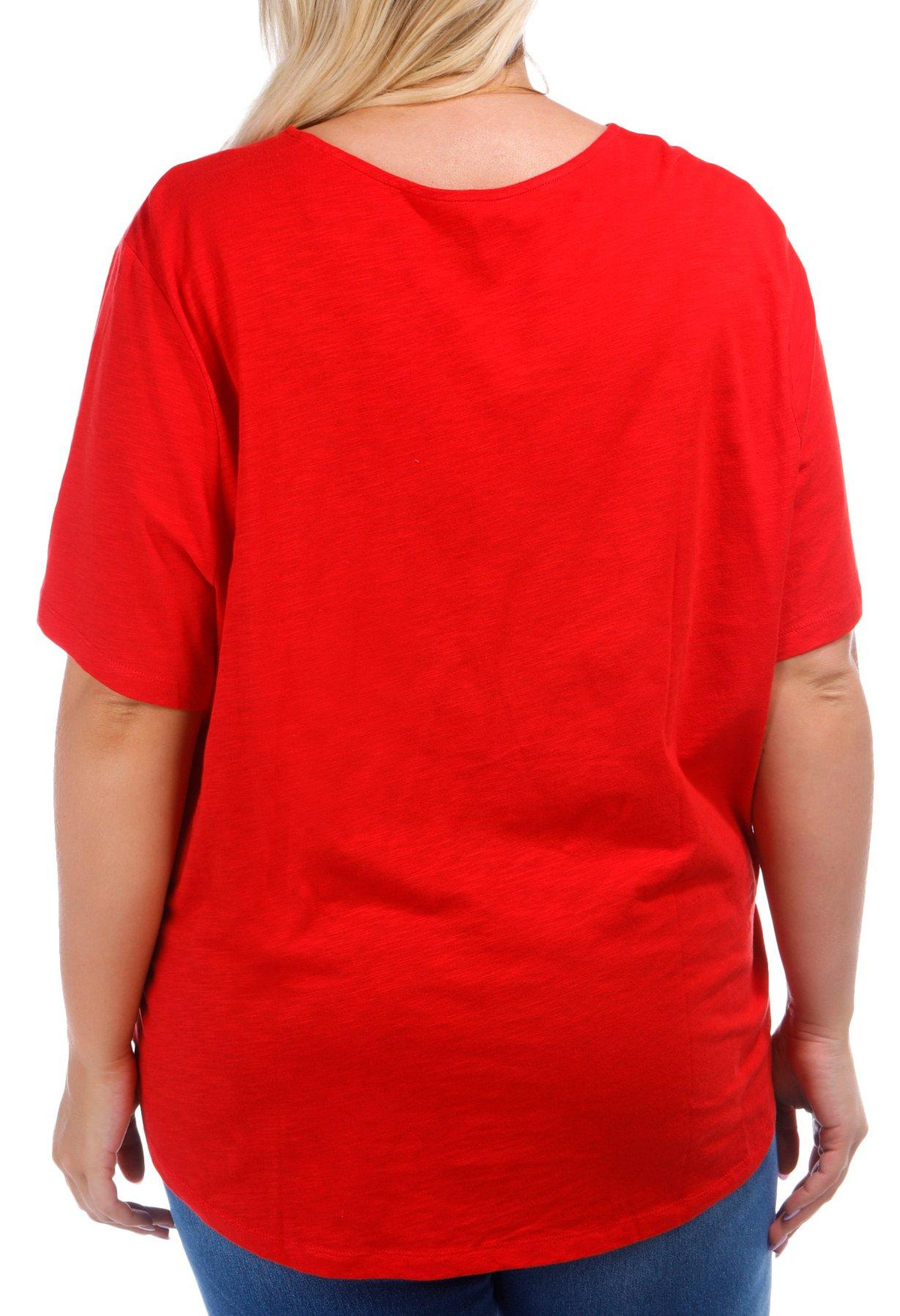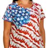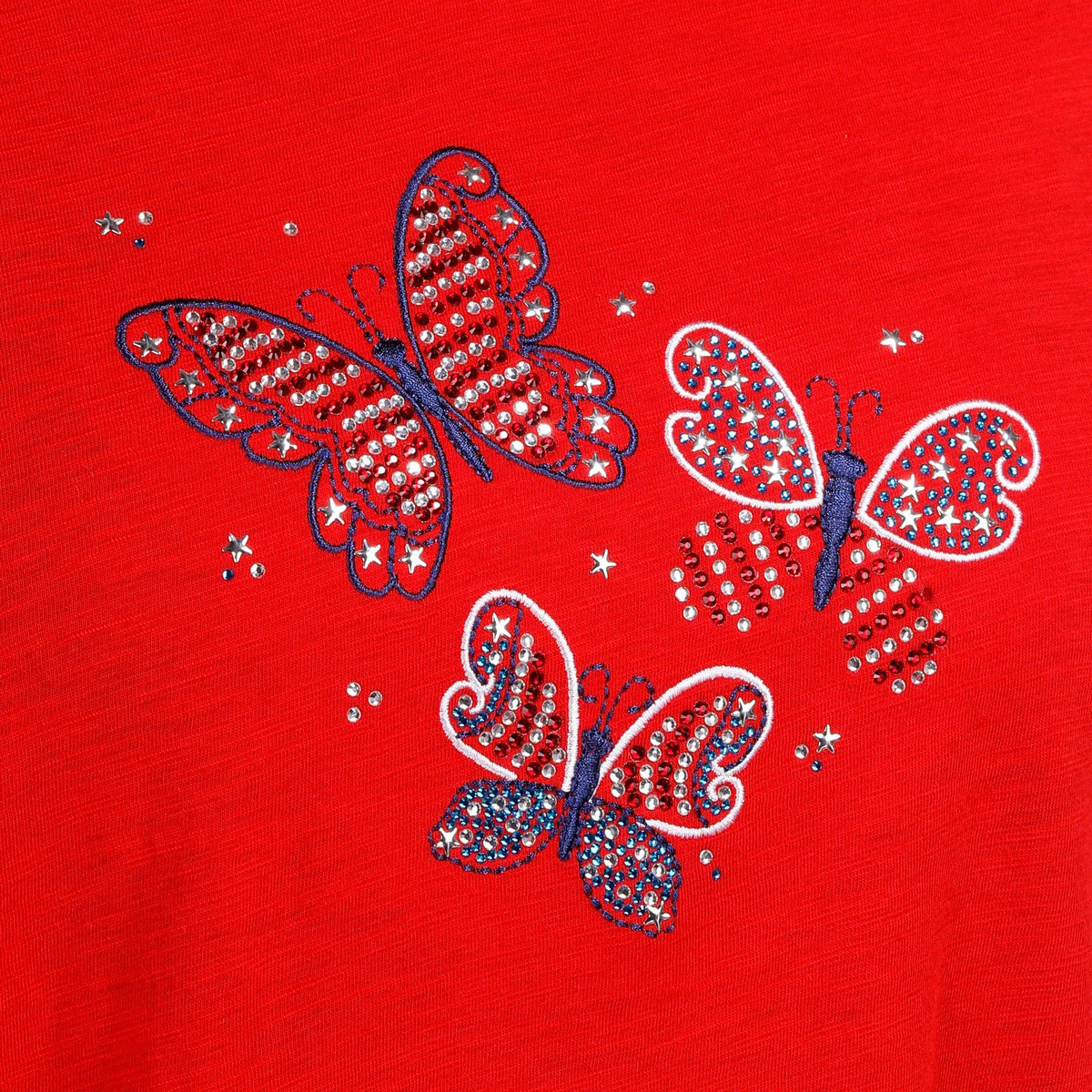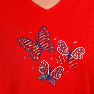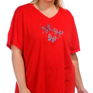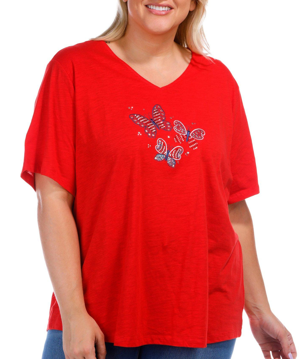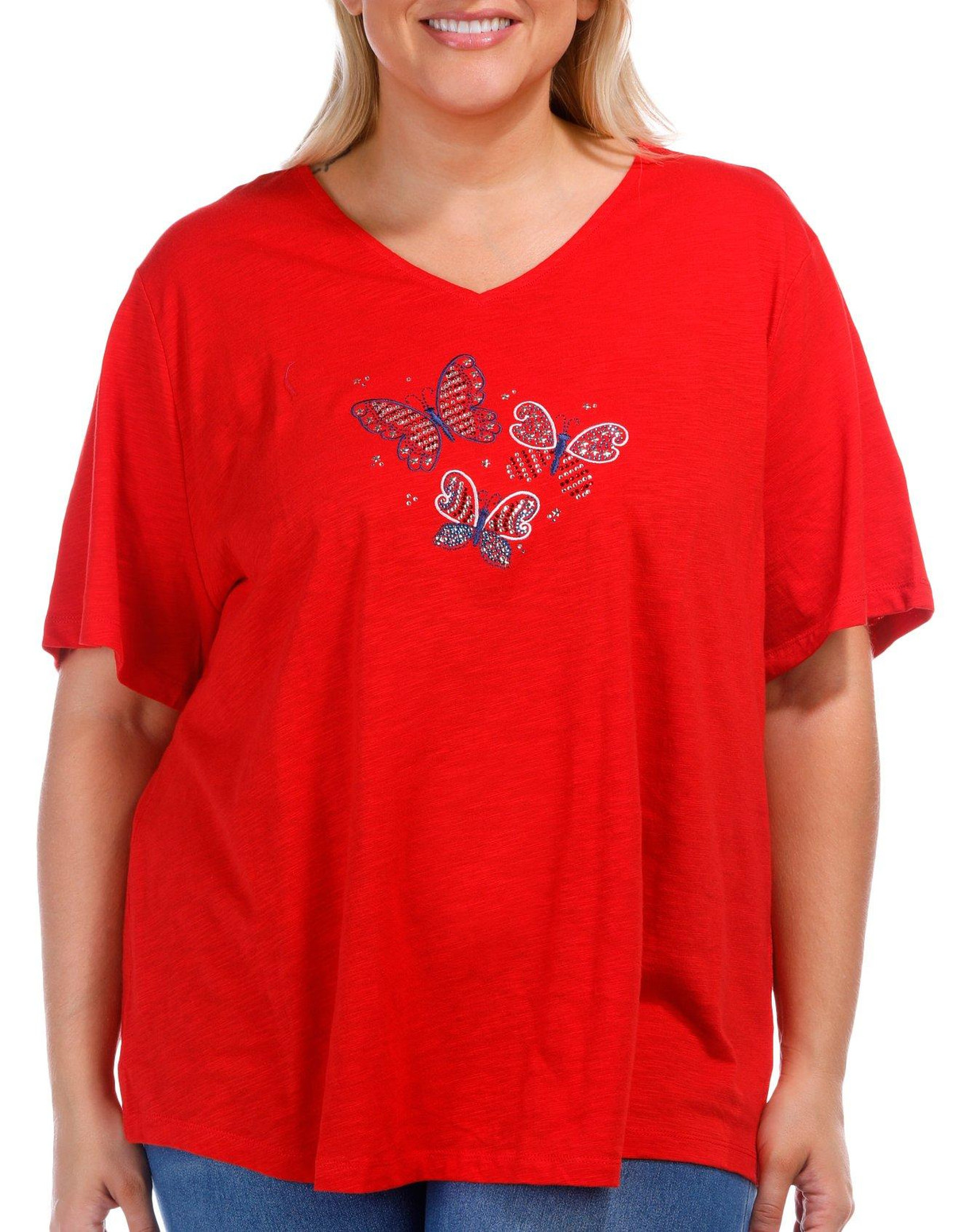 Show your patriotic flair with this Plus Embellished Three Butterflies Short Sleeve T-Shirt. Crafted from a soft cotton, it features a design of three butterflies adorned with sparkling rhinestones and stars. The short sleeves and flattering v-neckline add comfort and style, perfect for festive summer days. Fabrication is 100% Cotton. Top length measures approximately 29 in.