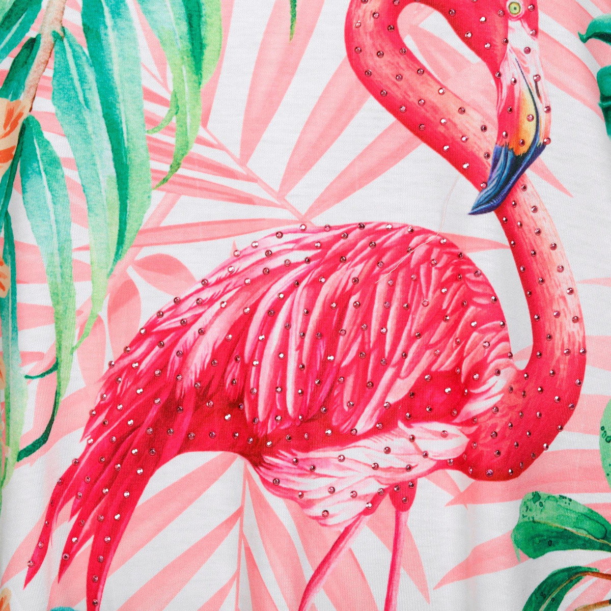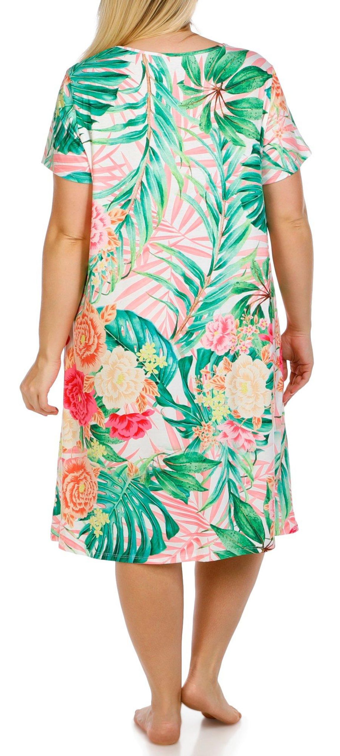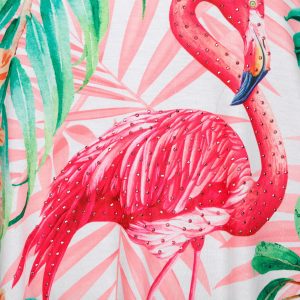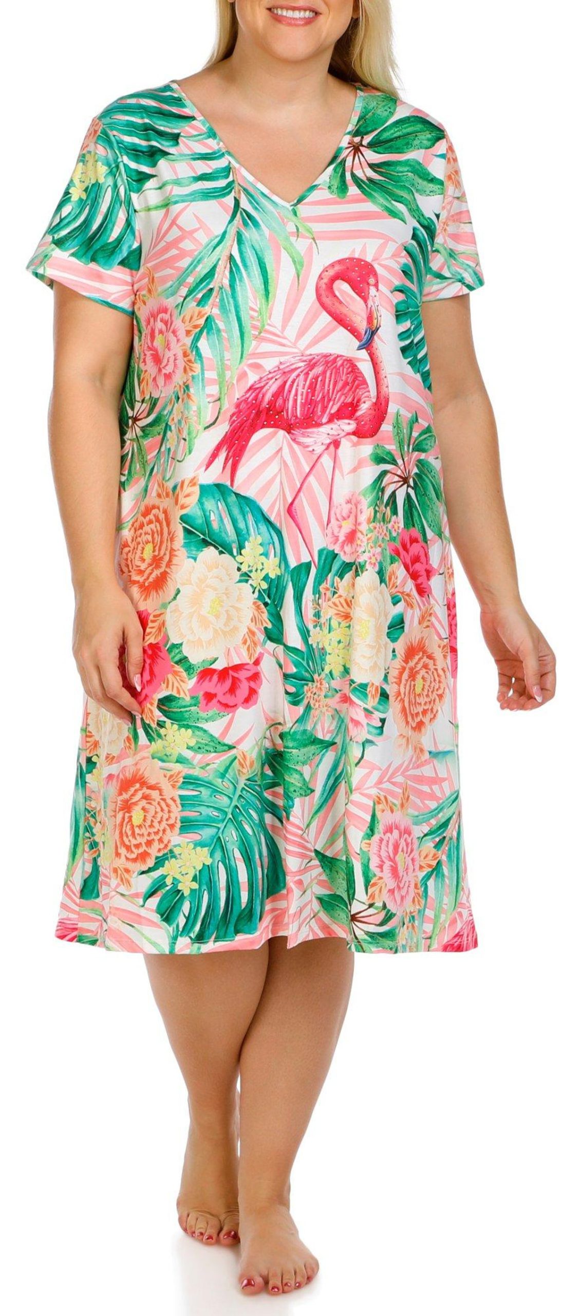 This plus size swing dress features short sleeves, a v-neckline, and a flamingo palm leaf graphic with rhinestone accents. Made from soft fabric, it offers a relaxed fit perfect for lounging, sleepwear, or casual activities. Fabrication 95% polyester, 5% spandex