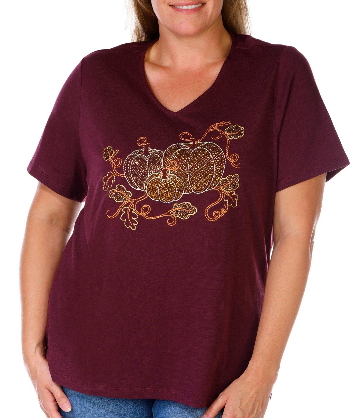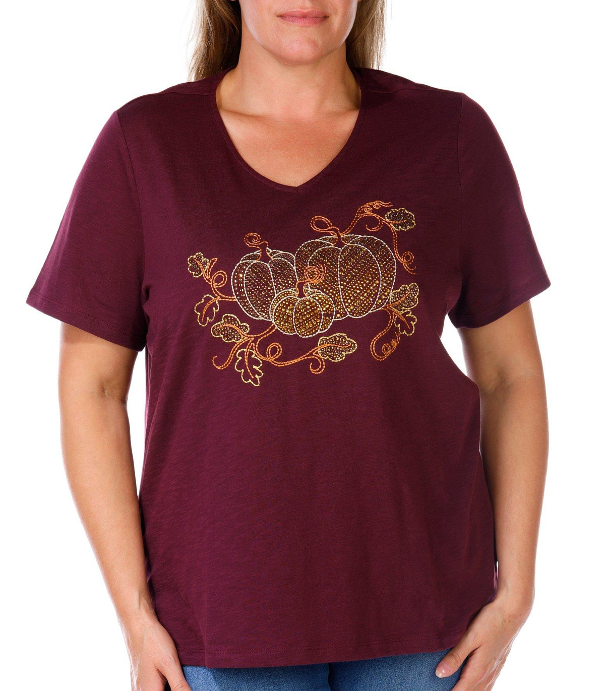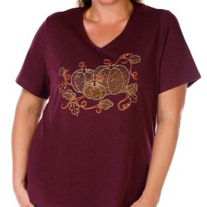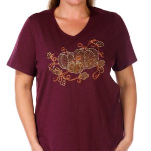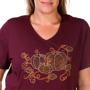 This women’s V-neck tee brings festive flair with playful embellishments arranged to form a charming pumpkin motif. Soft and flattering, it’s a spirited choice for seasonal style with a touch of sparkle. Fabrication is 60% cotton and 40% polyester.