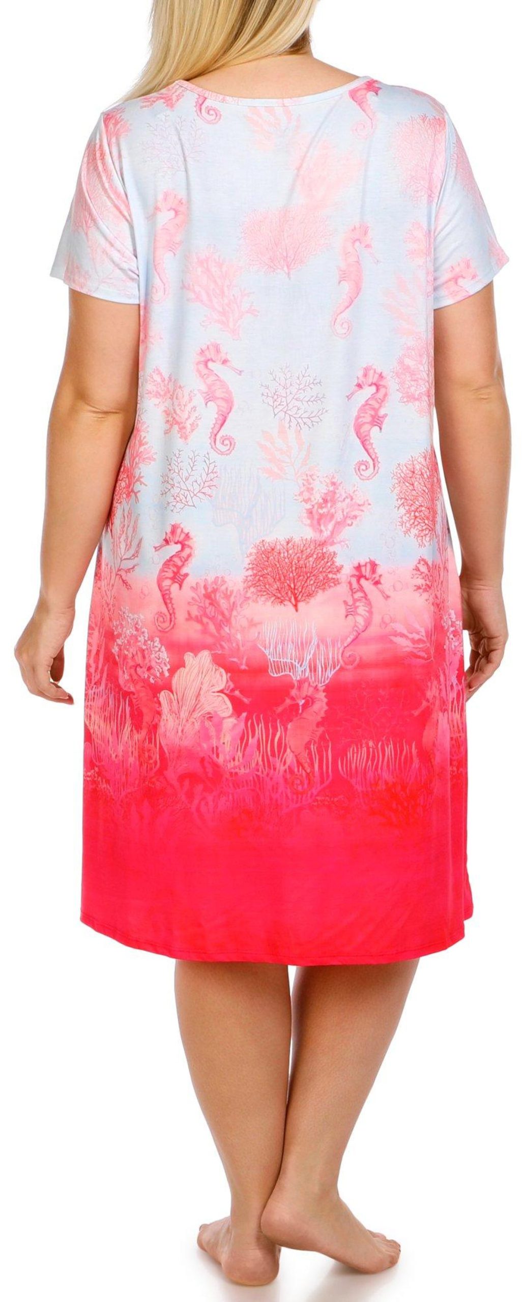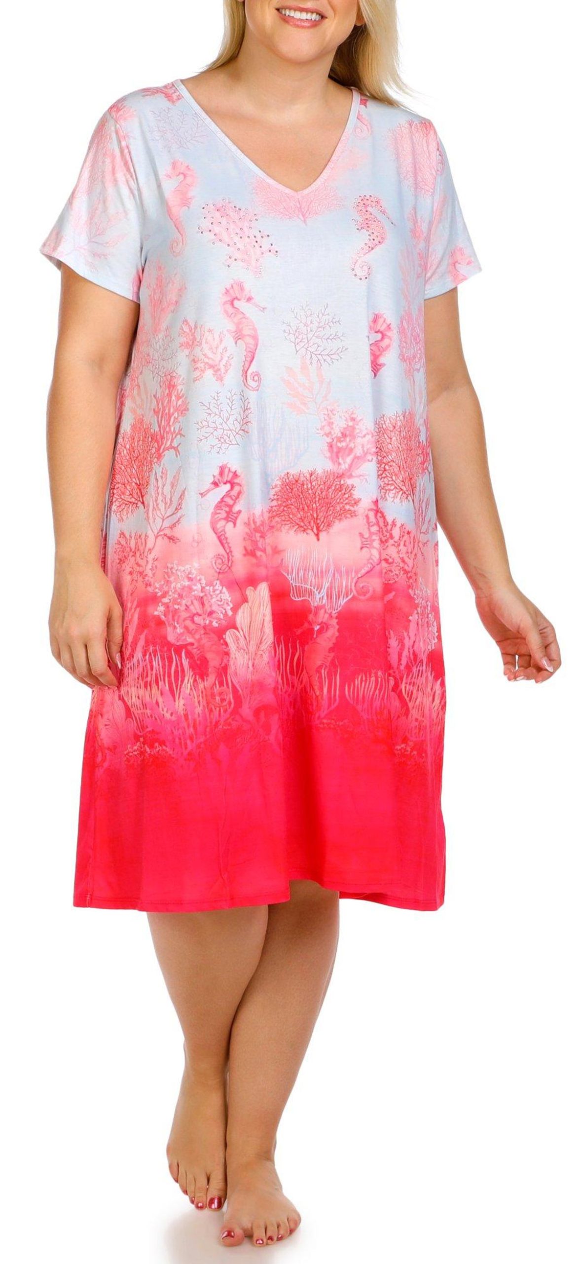 This plus size swing dress features short sleeves, a v-neckline, and a seahorse and coral graphic with rhinestone accents. Made from soft fabric, it offers a relaxed fit perfect for lounging, sleepwear, or casual activities. Fabrication 95% polyester, 5% spandex