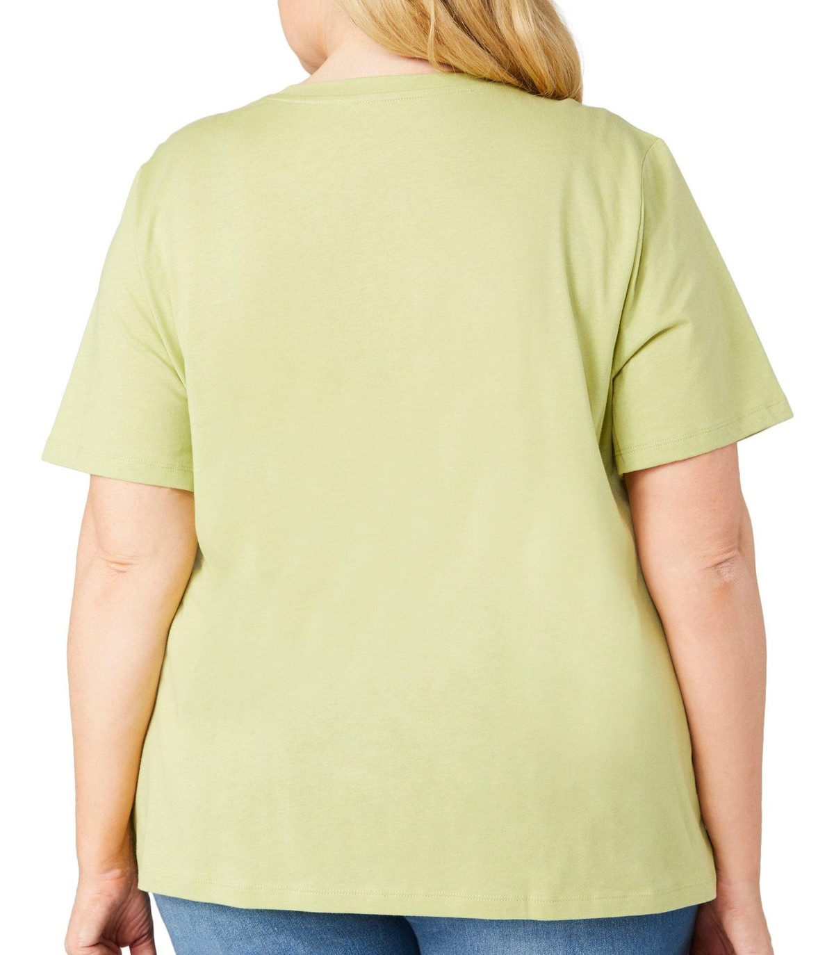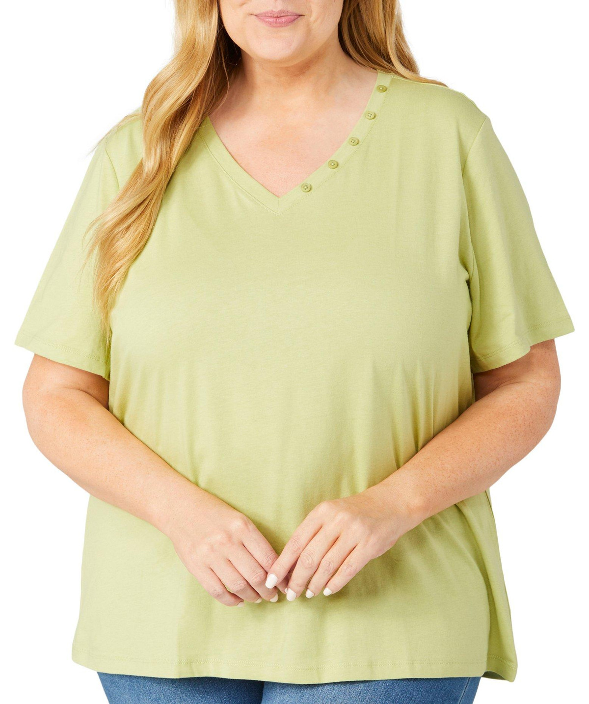 Coral Bay offers classic casual collections for your relaxed lifestyle. This short sleeve top features a solid color design on lightweight knit fabric, a V-neckline with decorative button detail, and classic styling. The top length measures approximately 25 in.
