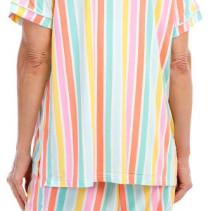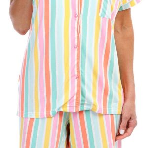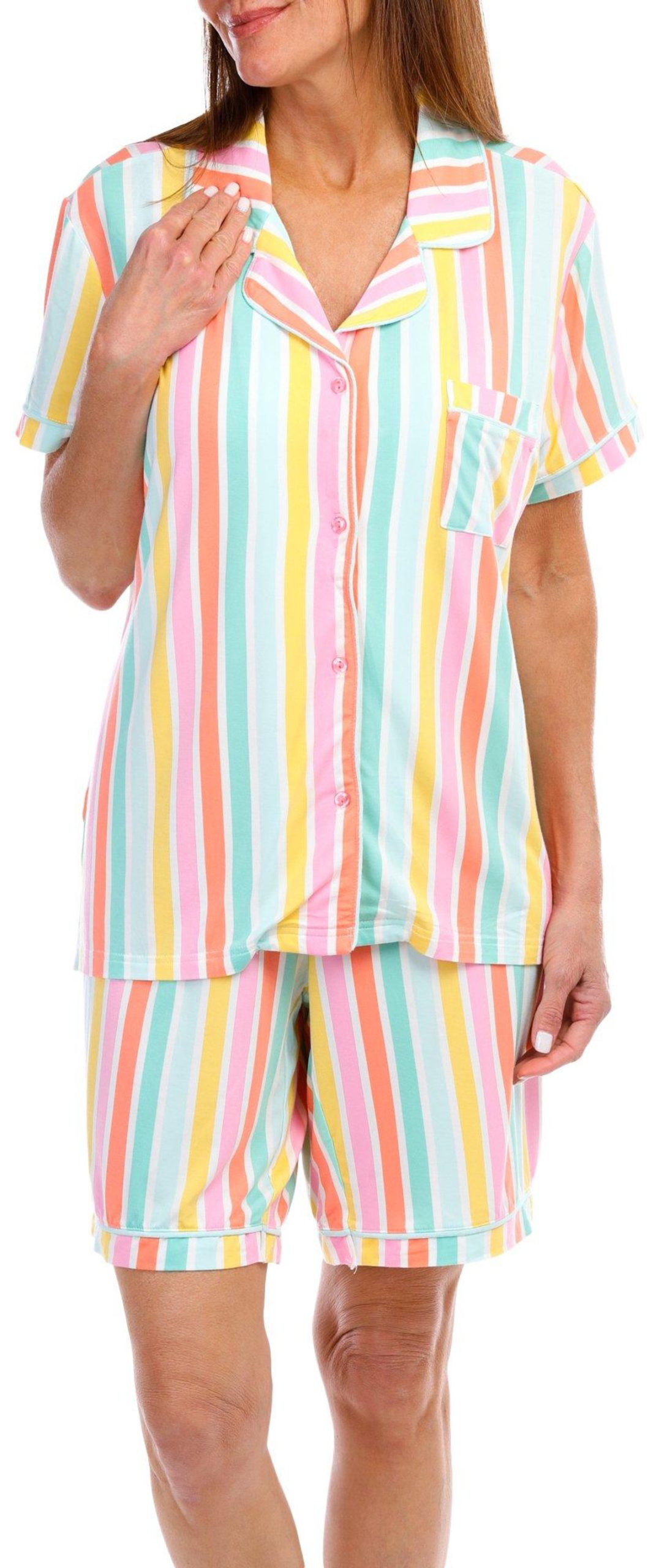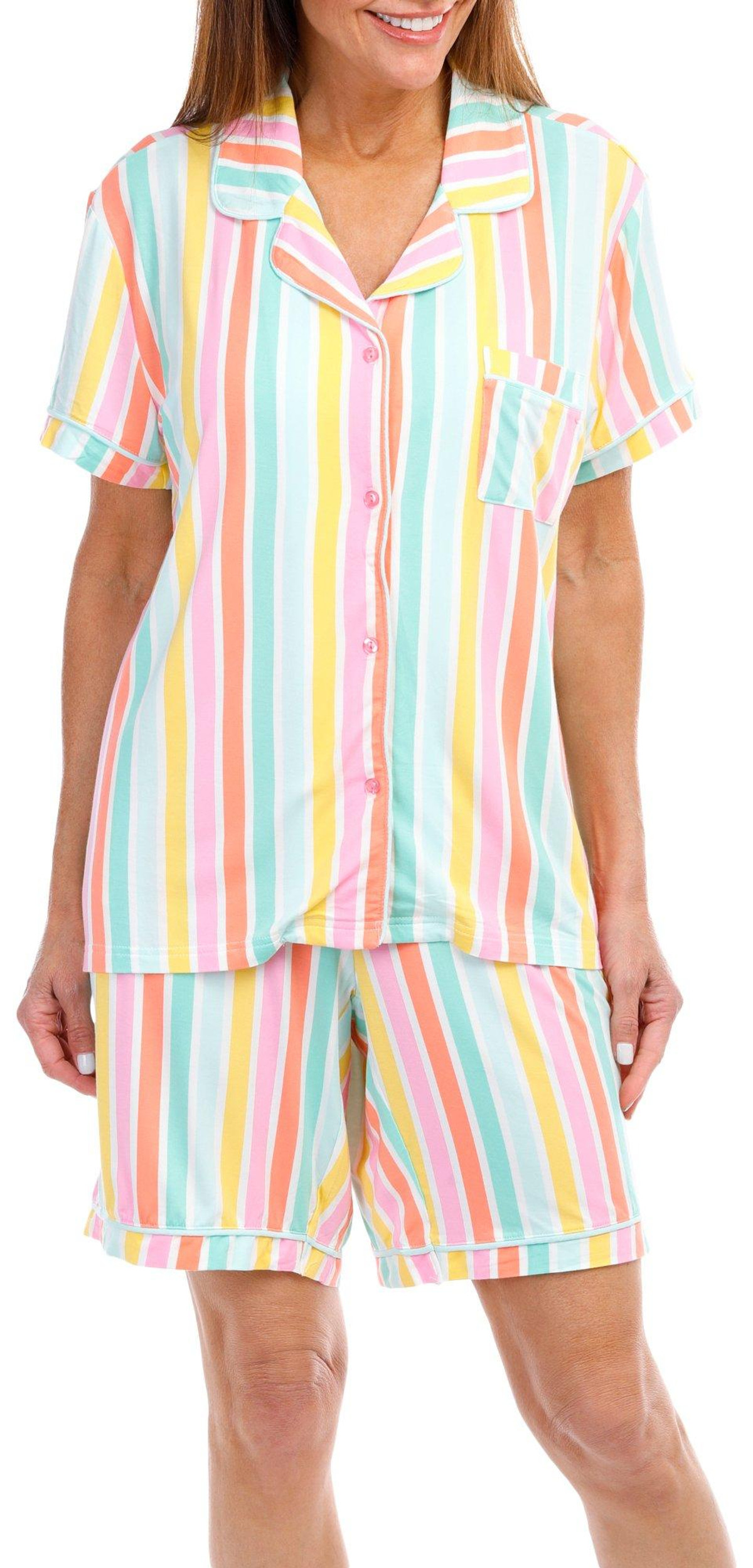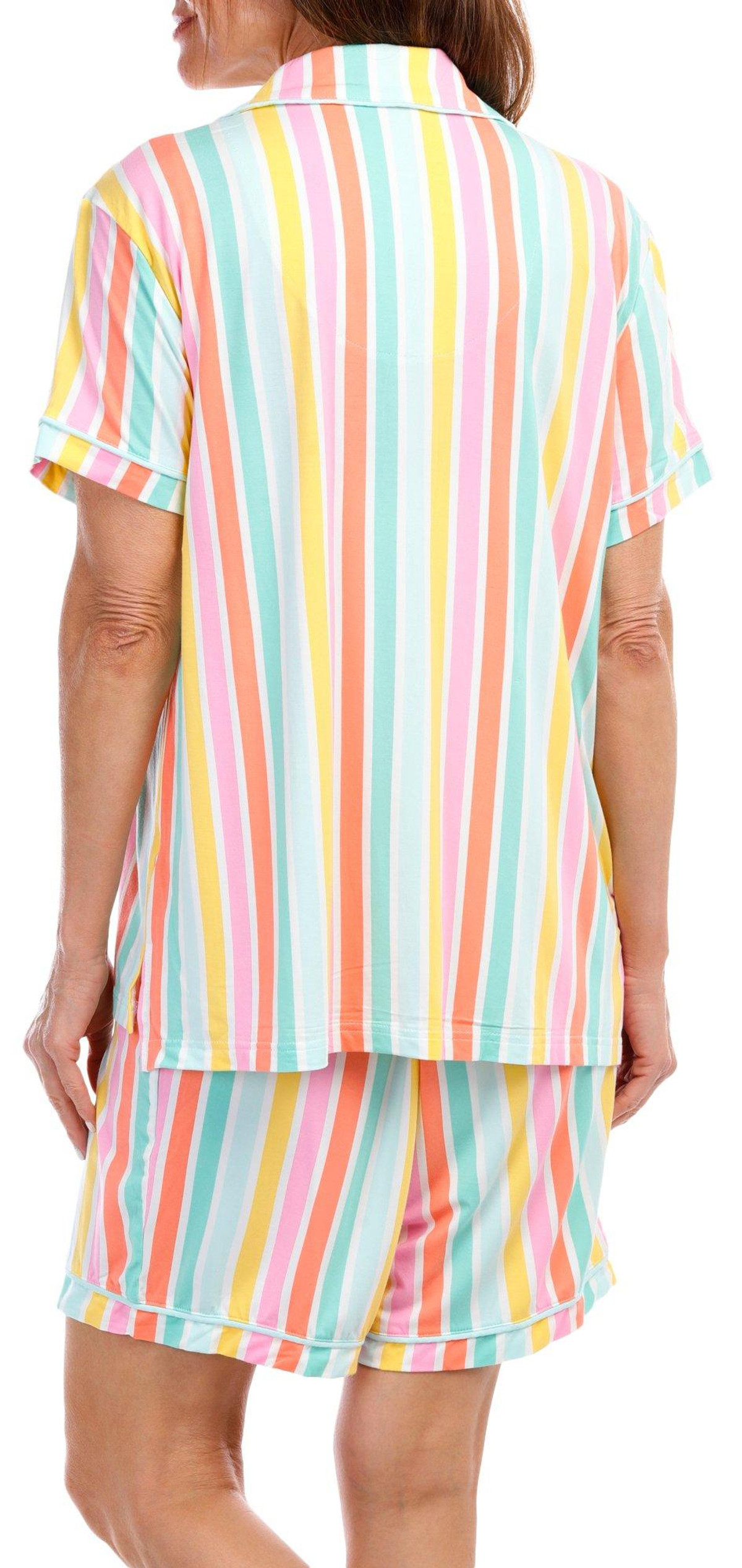 Stay cool and stylish with our 2-piece Cooling Sleepwear Set. This charming set includes a buttoned shirt and matching shorts, both adorned with a striped pattern. The drawstring waistband ensures a comfortable fit, while the front pockets and chest pocket add practical convenience. Made with cooling technology, this set is perfect for warm nights, offering a blend of comfort, functionality, and fun. Fabrication is 93% modal and 7% spandex.