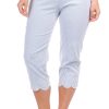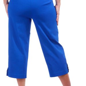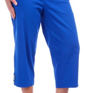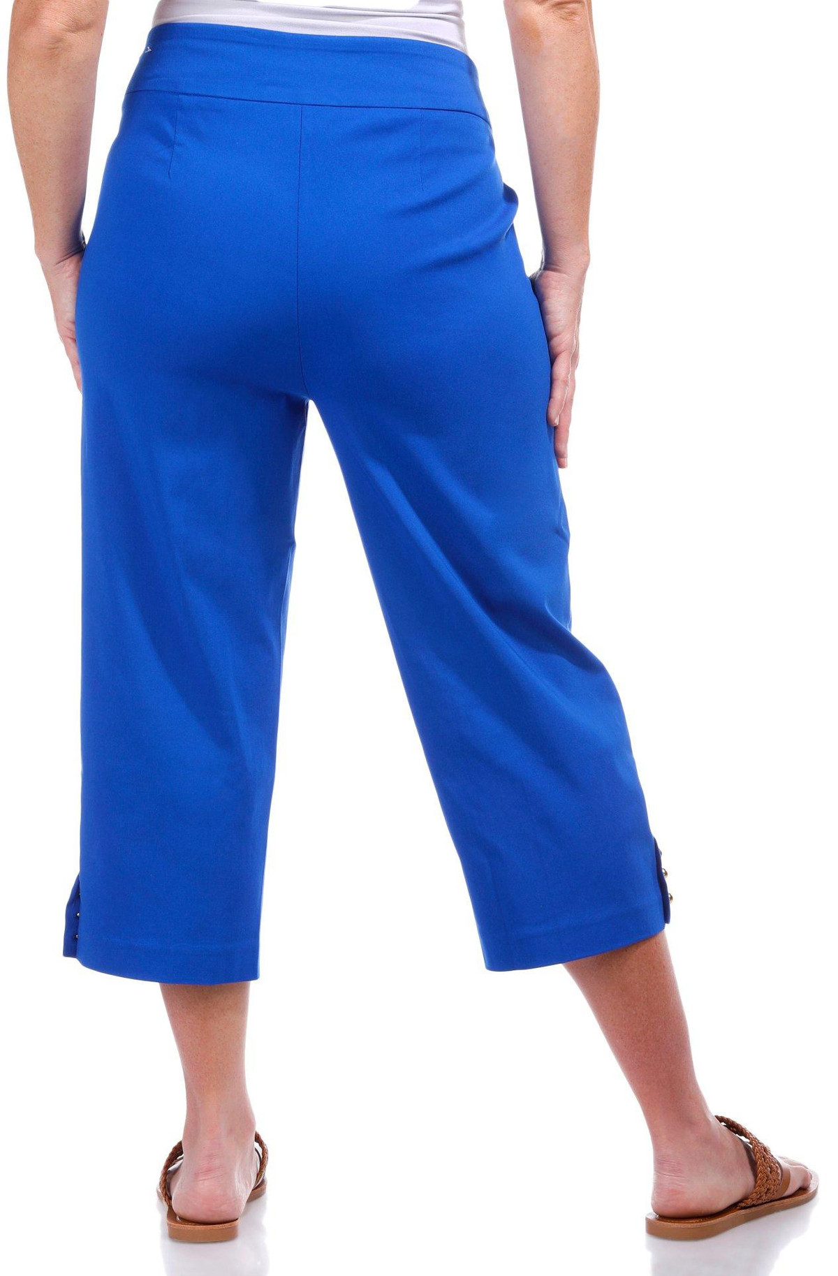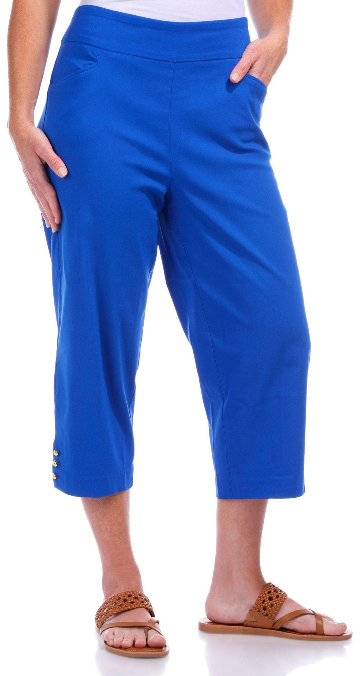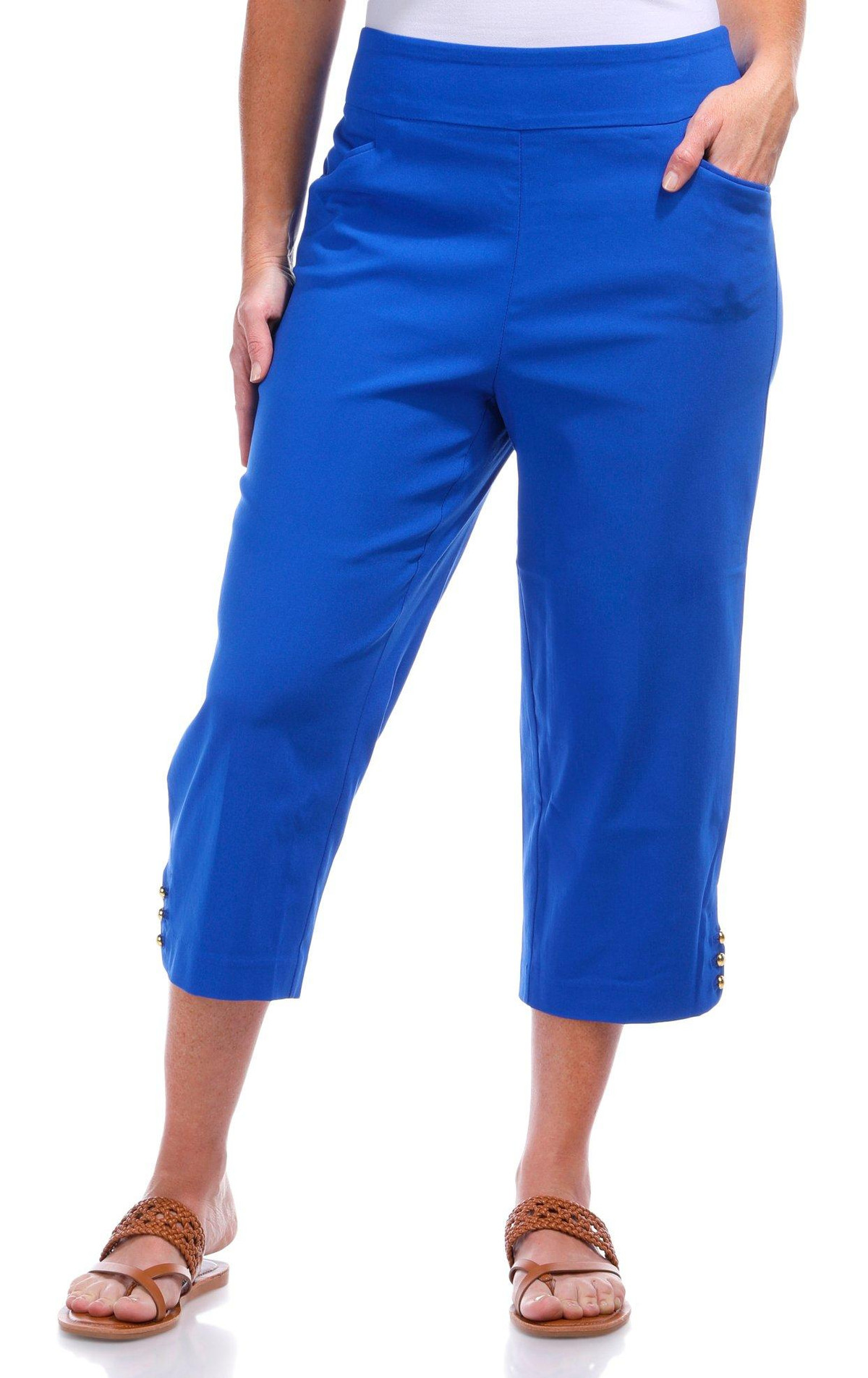 Elevate your everyday look with these womens 21 inch capris, crafted from a smooth blend of nylon, rayon, and spandex. Featuring a sleek solid color, gold bead accents at the ankle, and functional front pockets, these pull-on capris offer both comfort and a touch of glam.
