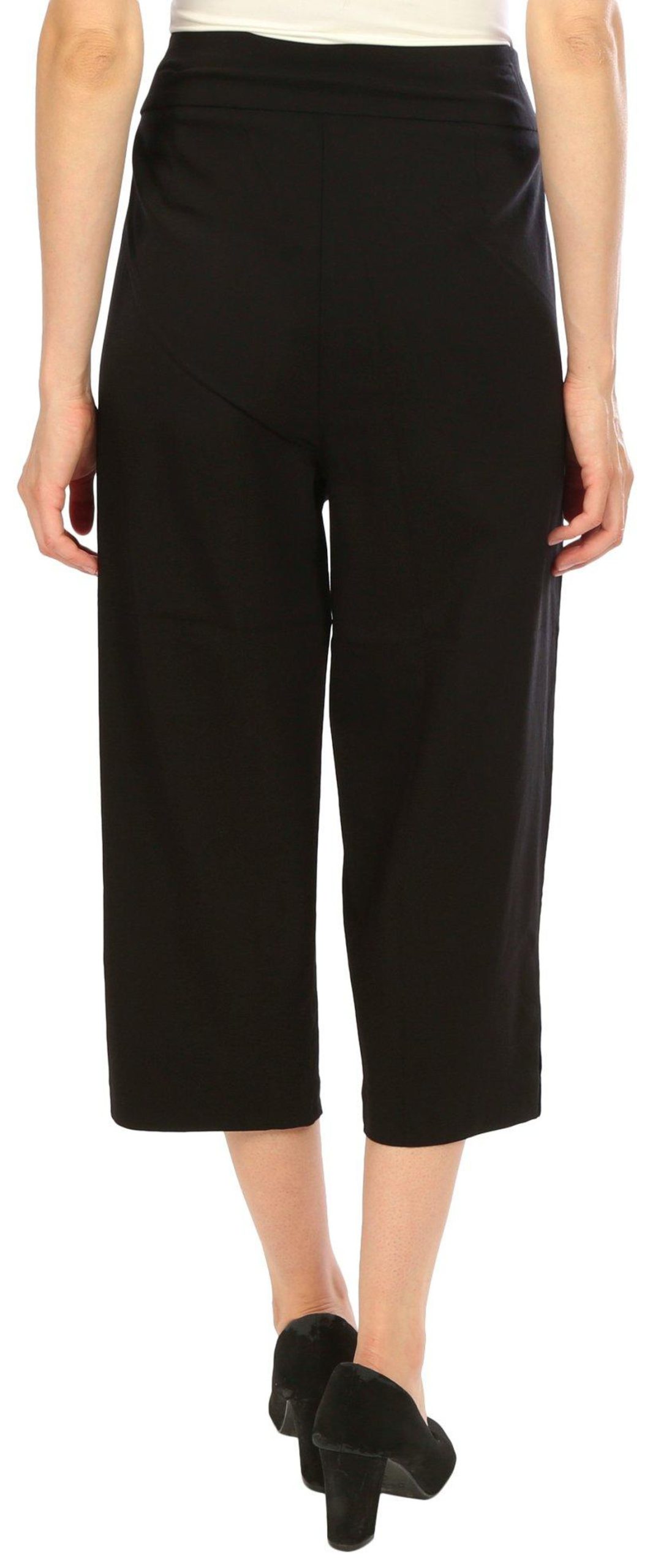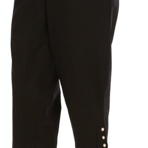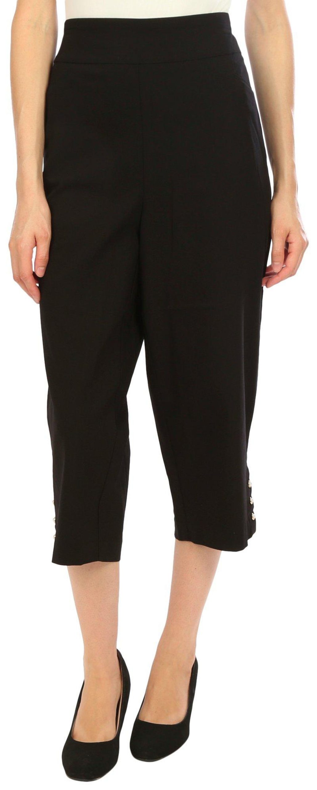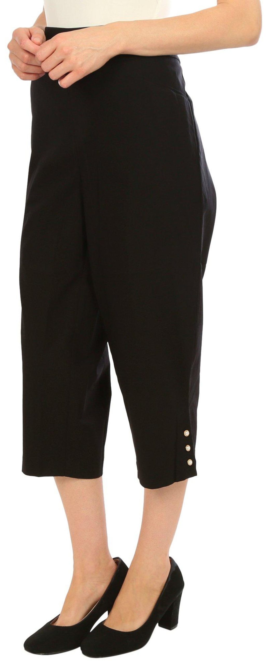 Introducing our Womens Pearl Button Capris Pants, the perfect blend of elegance and comfort. These capris feature a stylish solid color and chic pearl button accents on the hem, adding a touch of sophistication. With convenient side slip pockets and a comfortable pull-on waistband, they are designed for ease and style. Made from a high-quality blend of rayon, nylon, and spandex, these capris offer a flattering fit and lasting comfort. Inseam measures 21 in.
