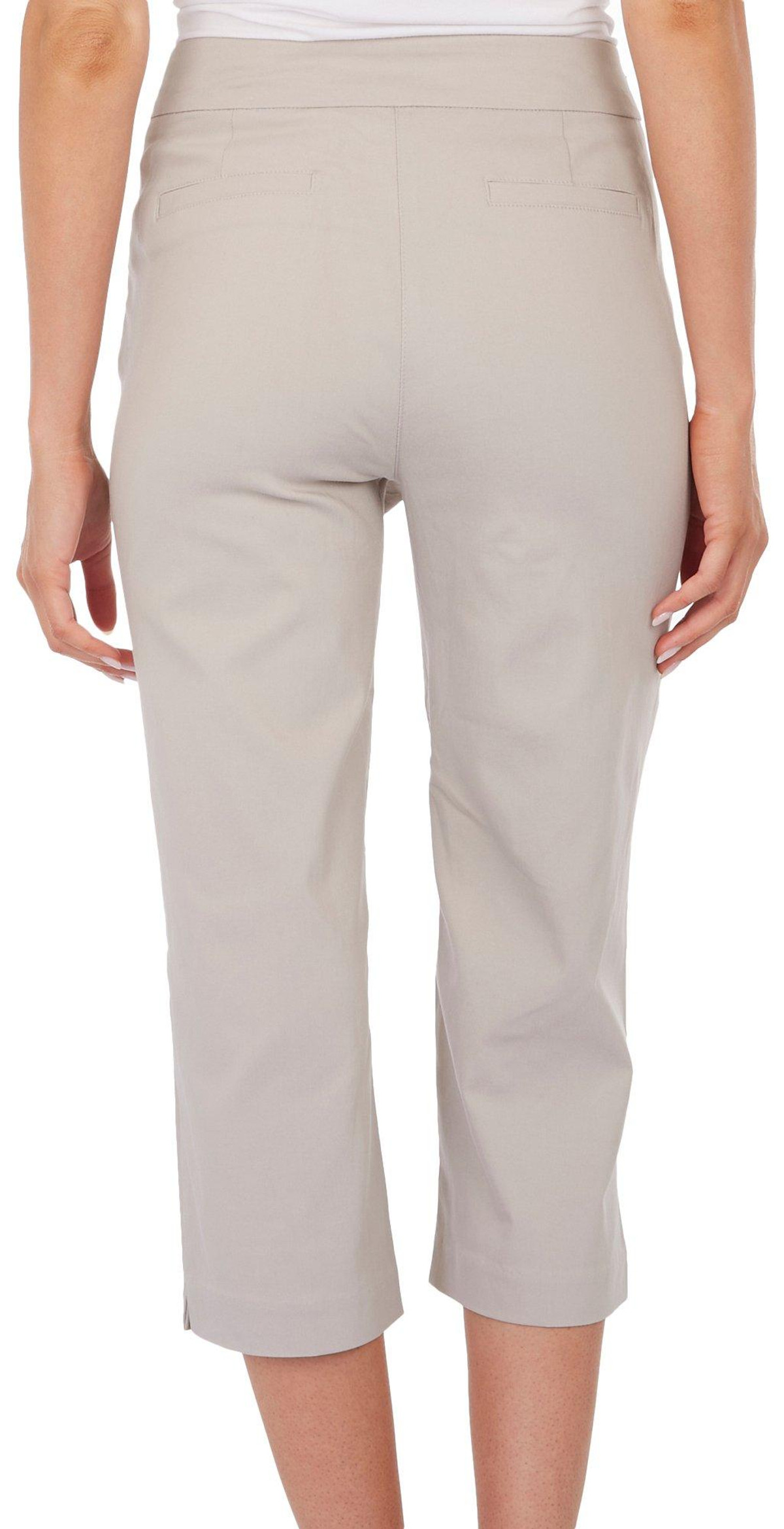 These pull-on capris feature a solid design on lightweight comfort stretch fabric, a hidden elastic waistband for optimal comfort, a slimming tummy panel, front pockets, two faux back pockets, and side split hemlines. Inseam measures approximately 21 inches. Fabrication 75% rayon, 22% nylon, 3% spandex.