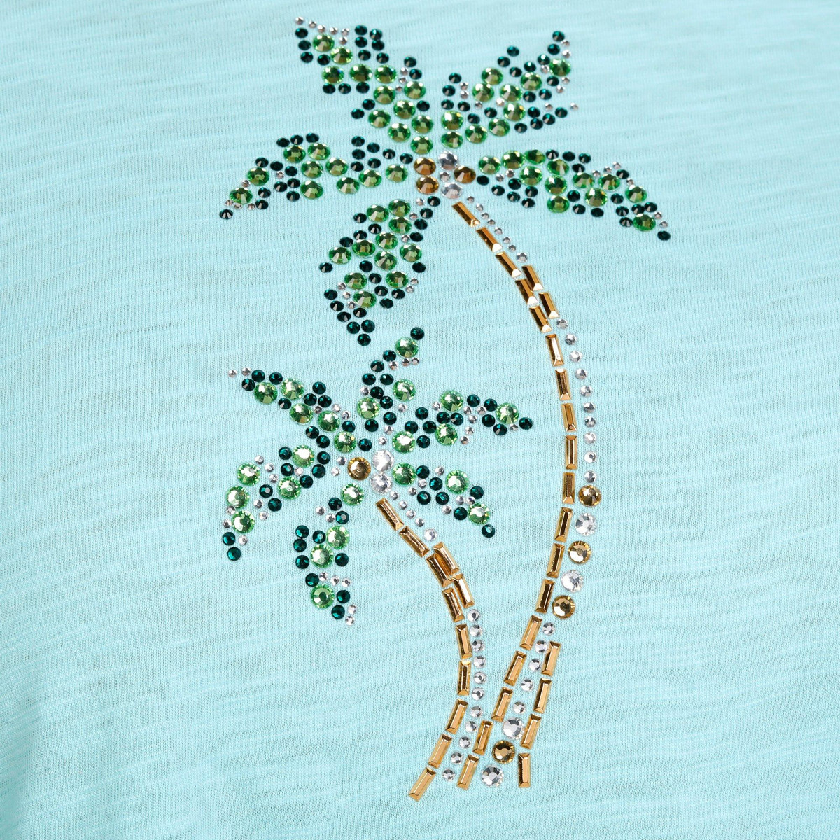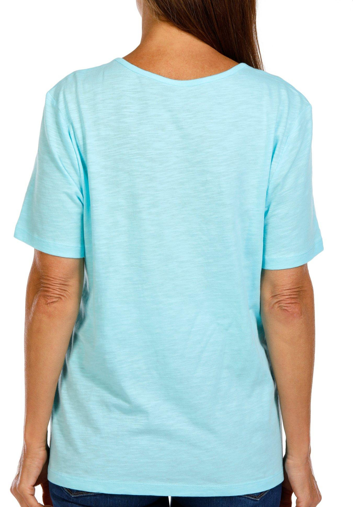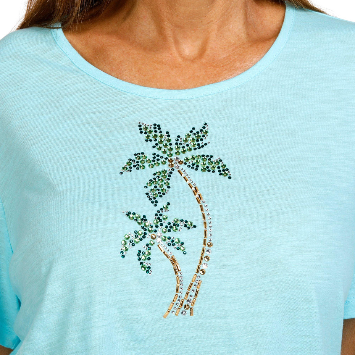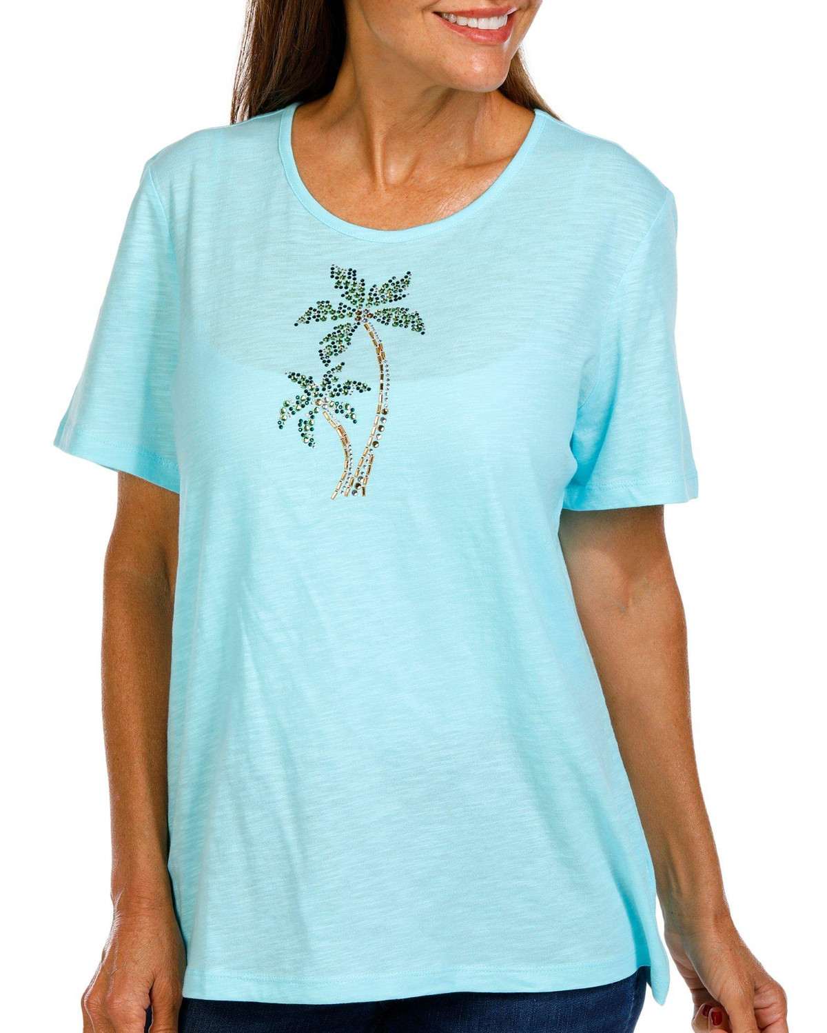 Show your fun side with this Womens Embellished Duo Beach Palms Short Sleeve T-Shirt. Crafted from a soft cotton, it features a beach design adorned with sparkling rhinestones. The short sleeves and flattering crew neckline add comfort and style, perfect for festive summer days. Fabrication is 100% cotton. Top length measures approximately 26 in.