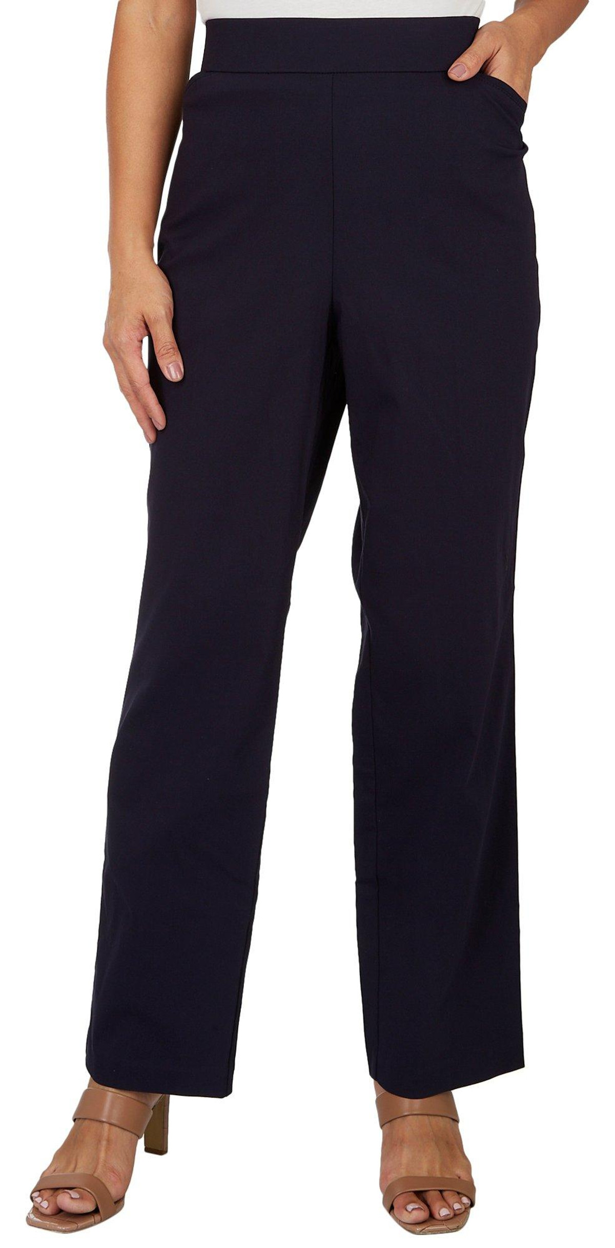 These pull-on pants feature a solid design on comfort stretch fabric, a hidden elastic waist, slimming tummy panel, two front slip pockets, and a classic fit. Inseam measures approximately 31 inches in length. Fabrication 75% rayon, 22% nylon, 3% spandex.