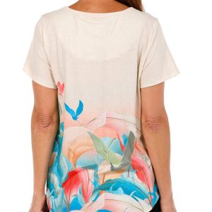 This women’s tee showcases a vibrant bird print on soft fabric with a classic crew neckline and short sleeves. The high to low hem adds a modern twist making it a playful yet comfortable choice for everyday wear. Fabrication 95% polyester, 5% spandex