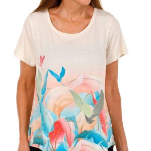 This women’s tee showcases a vibrant bird print on soft fabric with a classic crew neckline and short sleeves. The high to low hem adds a modern twist making it a playful yet comfortable choice for everyday wear. Fabrication 95% polyester, 5% spandex