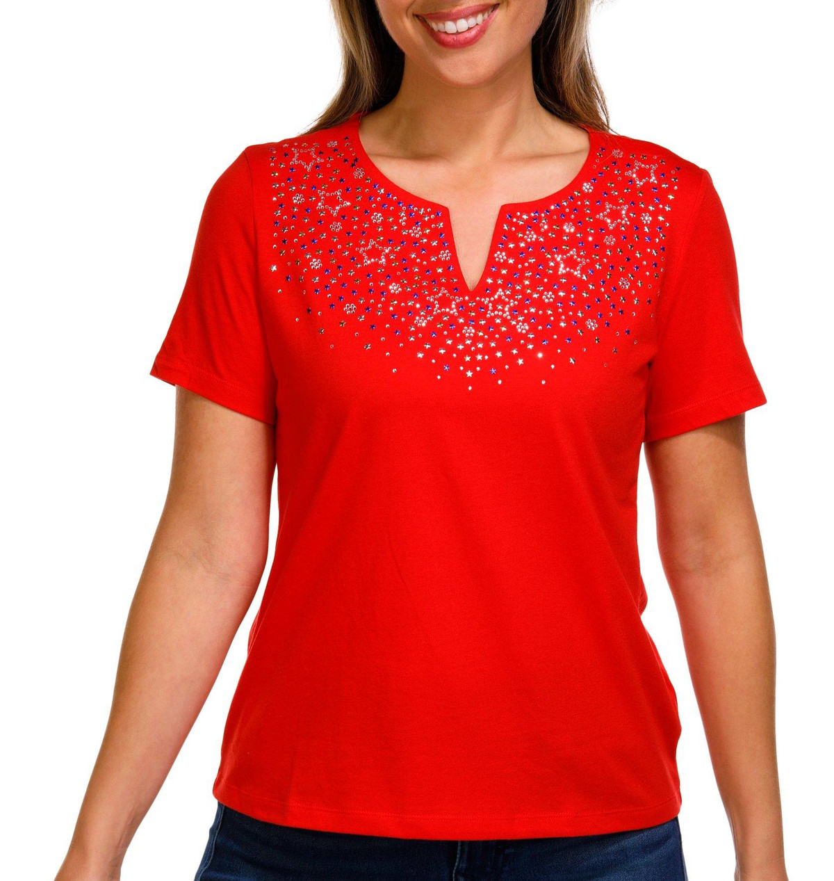 Show off your patriotic flair with this Women’s Split Neck Americana Star Top. Crafted from a soft cotton-poly blend, it features a sparkling rhinestone star design, a stylish split neckline, and short sleeves.