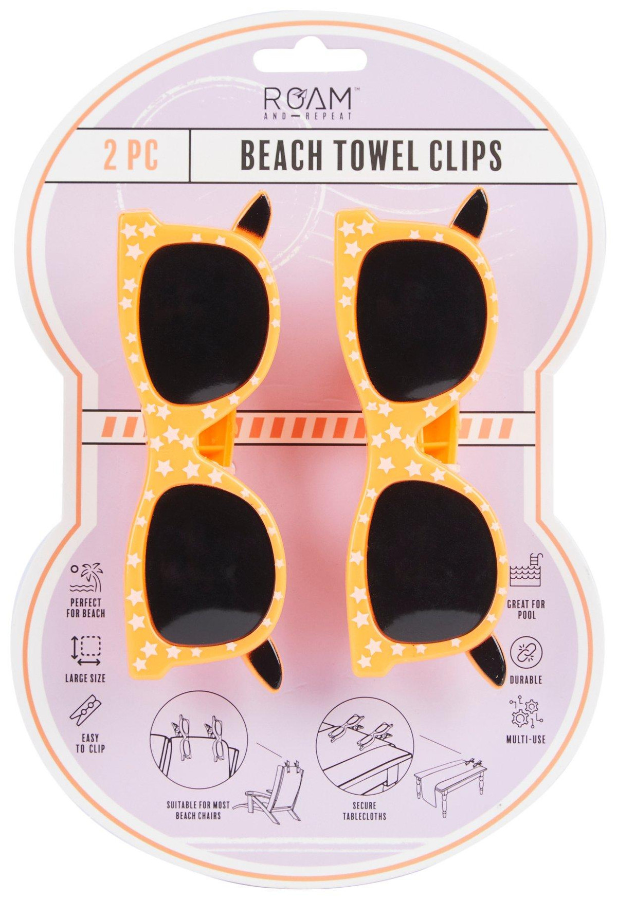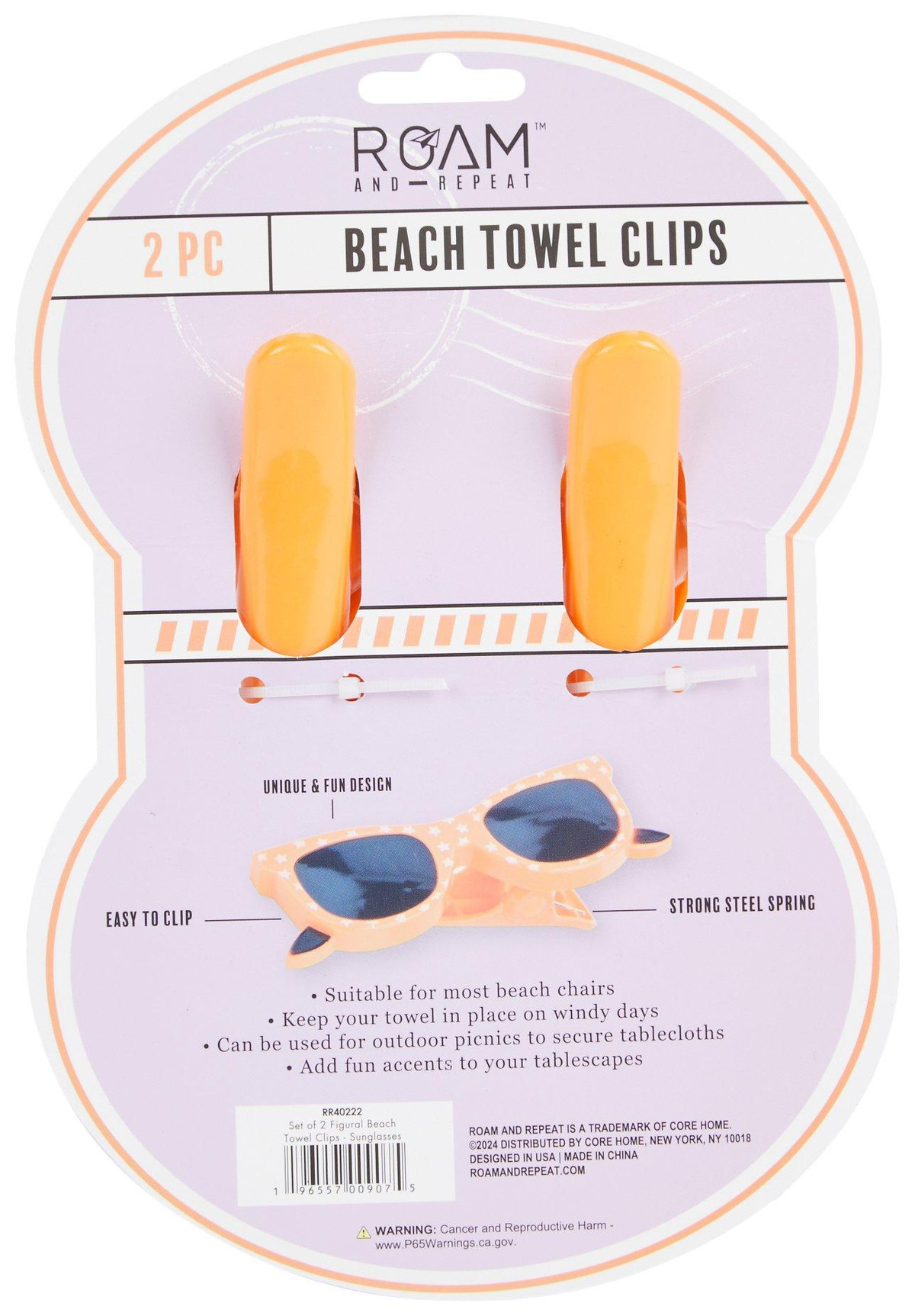 Fun beach towels clips in the shape of a pair of sunglasses – set of 2. Fits most beach chairs and can be used to secure outdoor table cloth. Measures approximately 5 in x 2 in x 2 in.