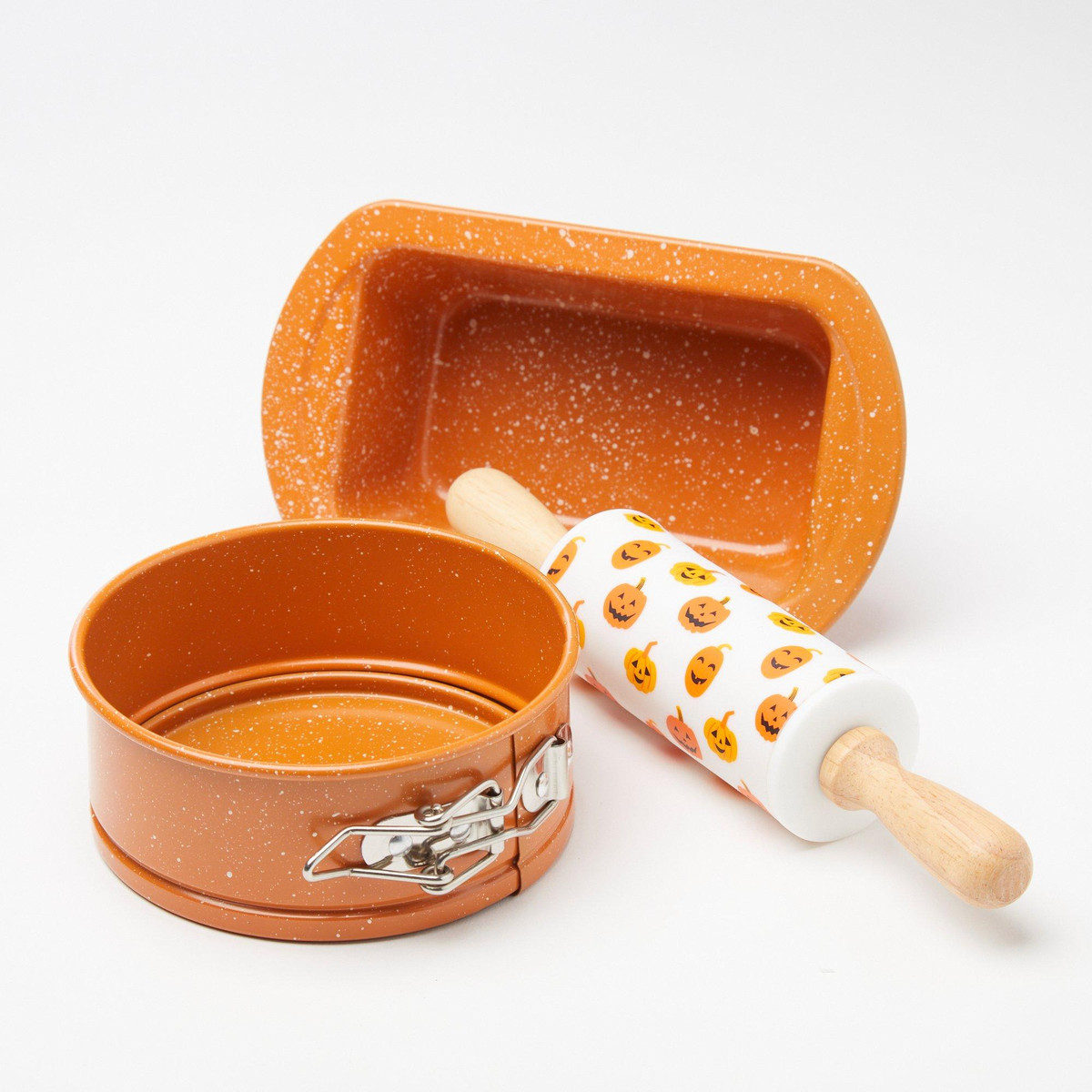Celebrate Halloween in the kitchen with this festive 3-piece mini bake set! Includes a non-stick carbon steel orange mini loaf pan, orange mini springform pan, and a bamboo rolling pin decorated with cute pumpkin designs. Perfect for baking small seasonal treats with spooky style.