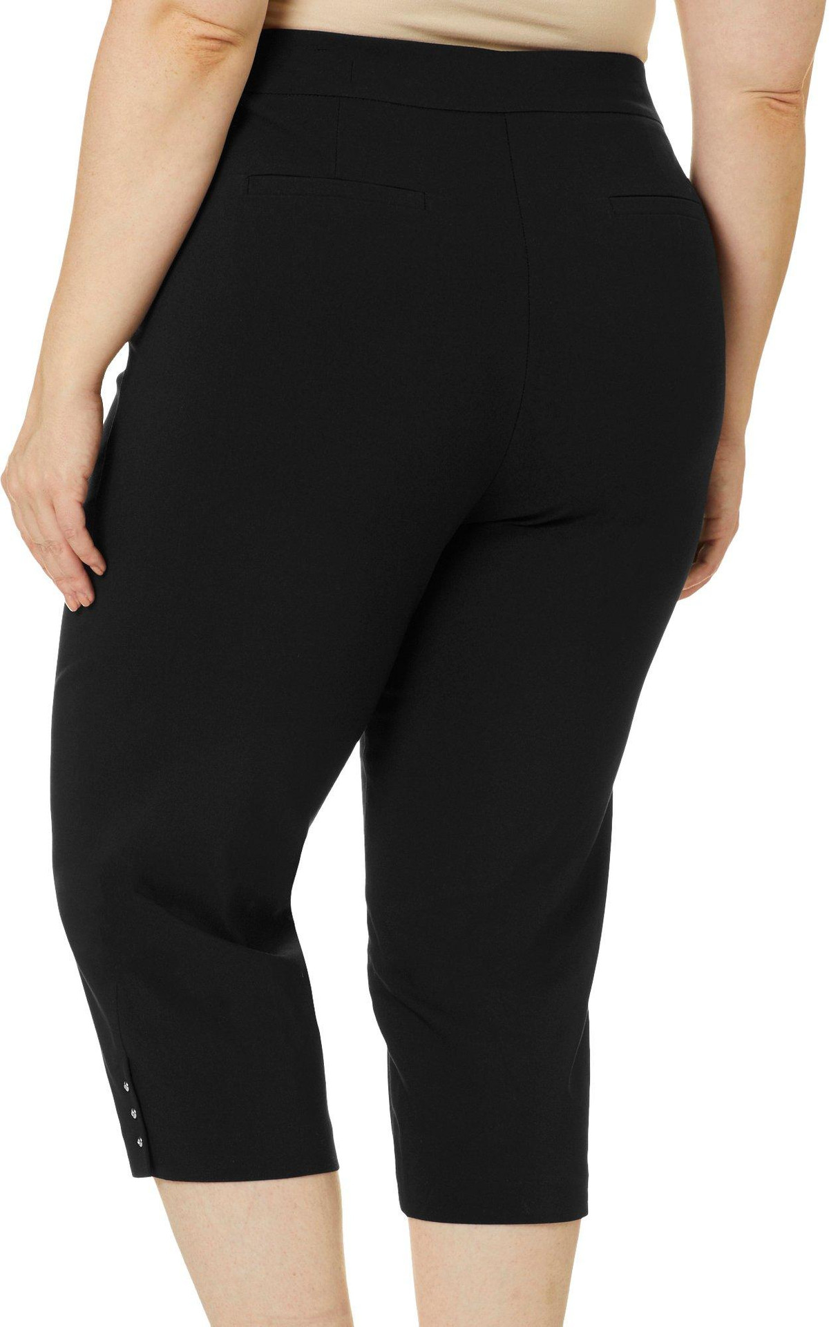 Counterparts offers a stylish look and a comfortable fit. These capris feature a solid color design, a flat front, faux pockets, and side splits with button accents. Inseam is approximately 21 inches.