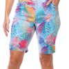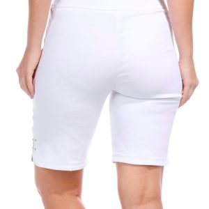 These womens shorts feature a solid color with a 10 inch inseam and a comfortable pull on waistband. Made of nylon, rayon, and spandex they offer stretch and ease with dome rivet accents on the side hem for a stylish touch.