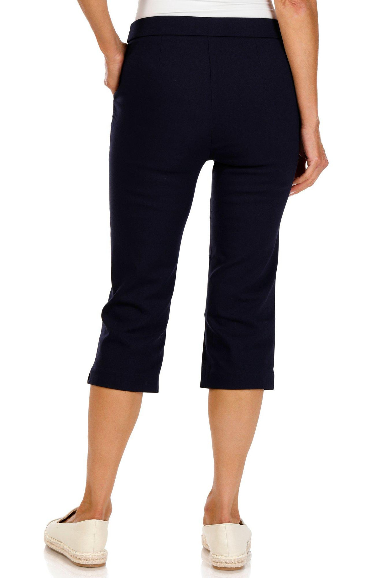 These stylish capris are ideal for your next trip out on the town, the office, and anywhere else! They feature a solid color design, flat front, and two front pockets with chain waist accents. Inseam is approximately 21 inches. Fabrication is 75% rayon, 22% nylon, and 3% spandex.