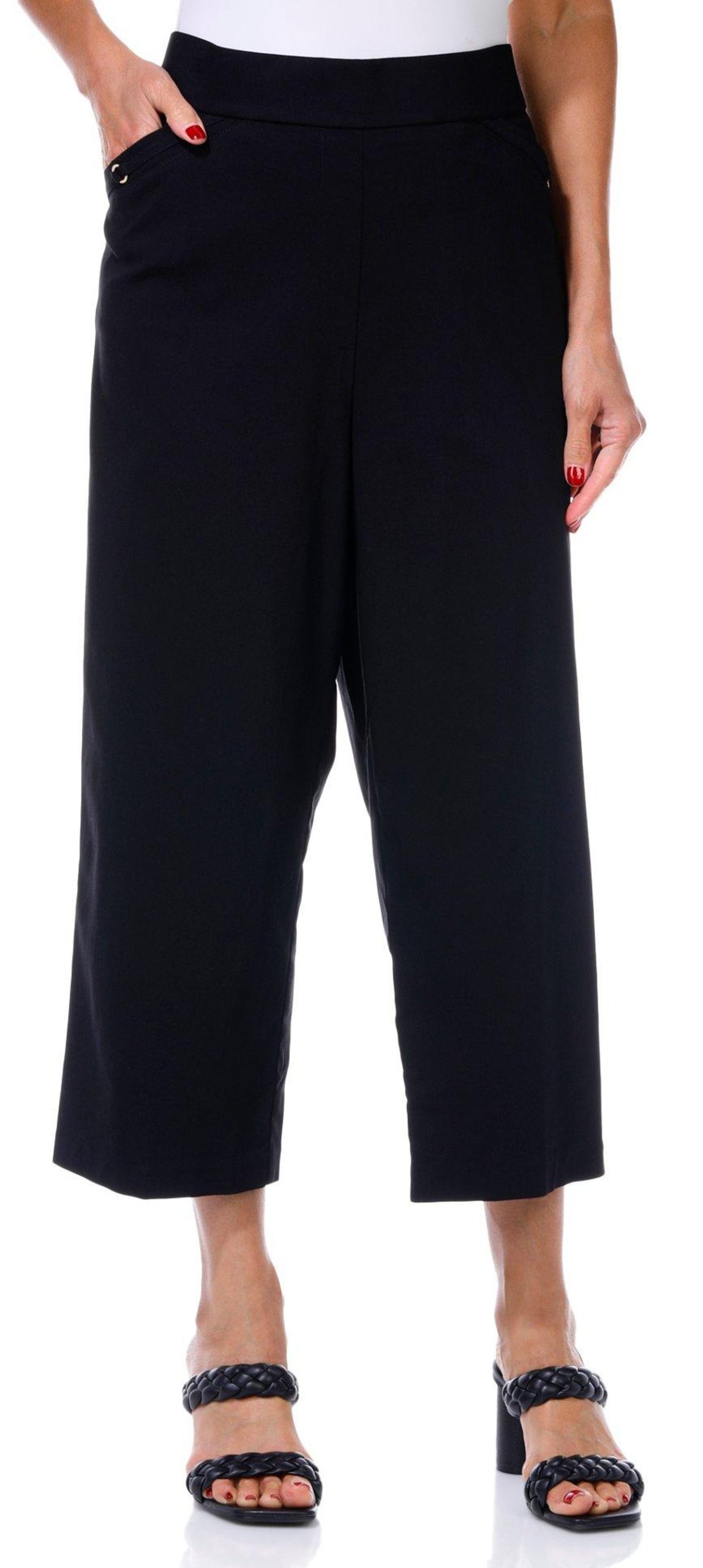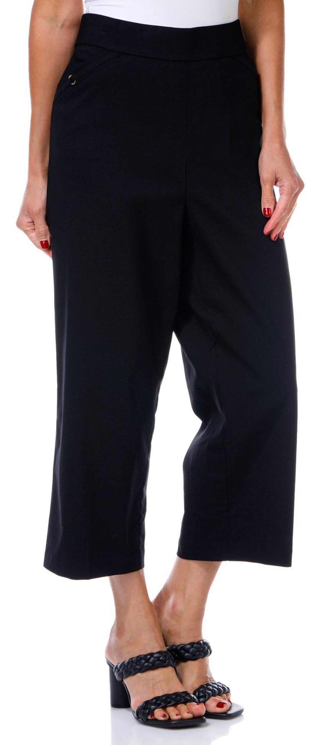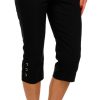 These Cat Eye Capris are designed to move with you in sleek style. Made from 76% rayon, 21% nylon, and 3% spandex with 100% cotton trim, they offer super stretch and an elastic waist that molds comfortably to your shape. Gold rings above the two front pockets add a chic accent. Machine washable for easy care, they are made for everyday elegance and comfort.