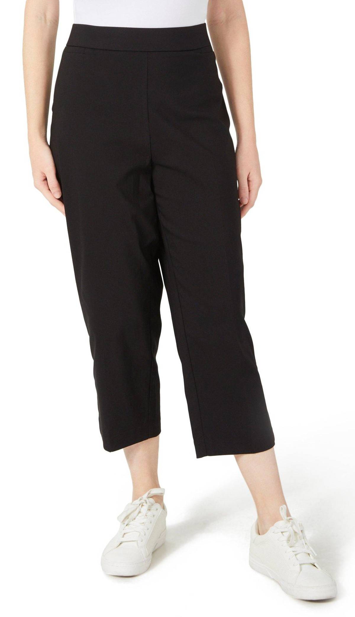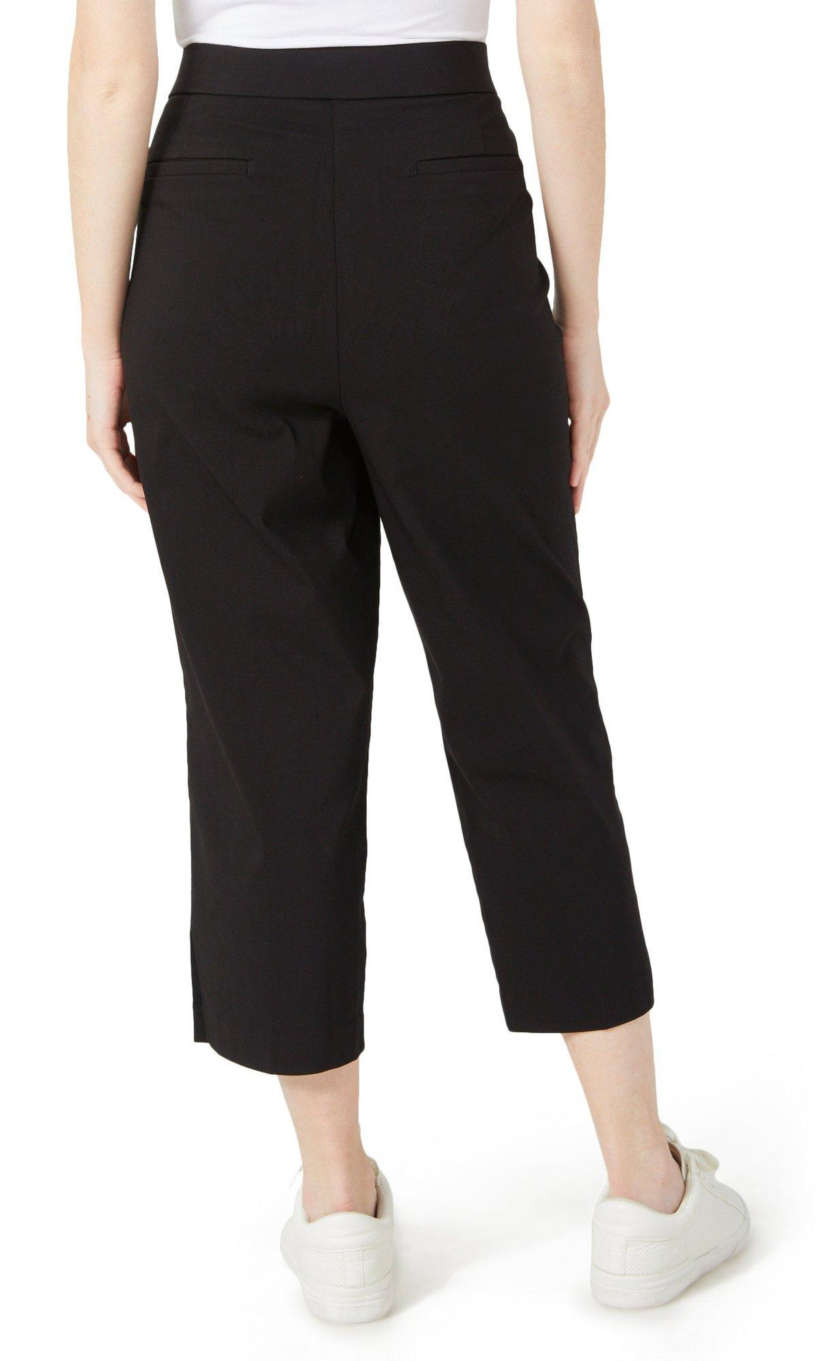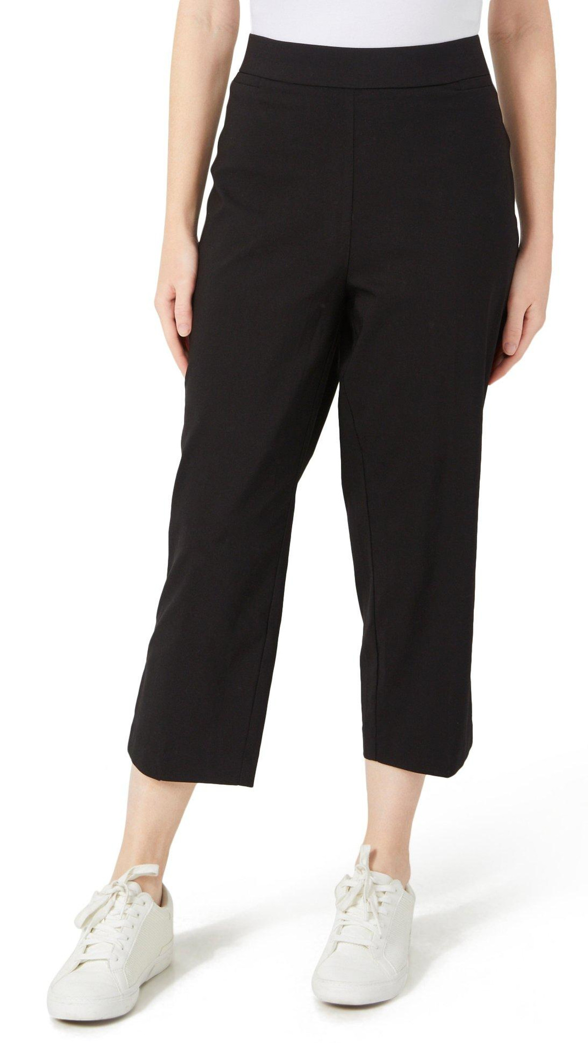 These womens capris feature a solid color with a 23 inch inseam and a sleek modern silhouette. Made of nylon, rayon, and spandex they offer stretch and comfort with a pull on waistband faux welt pocket look and slit hem for added style.
