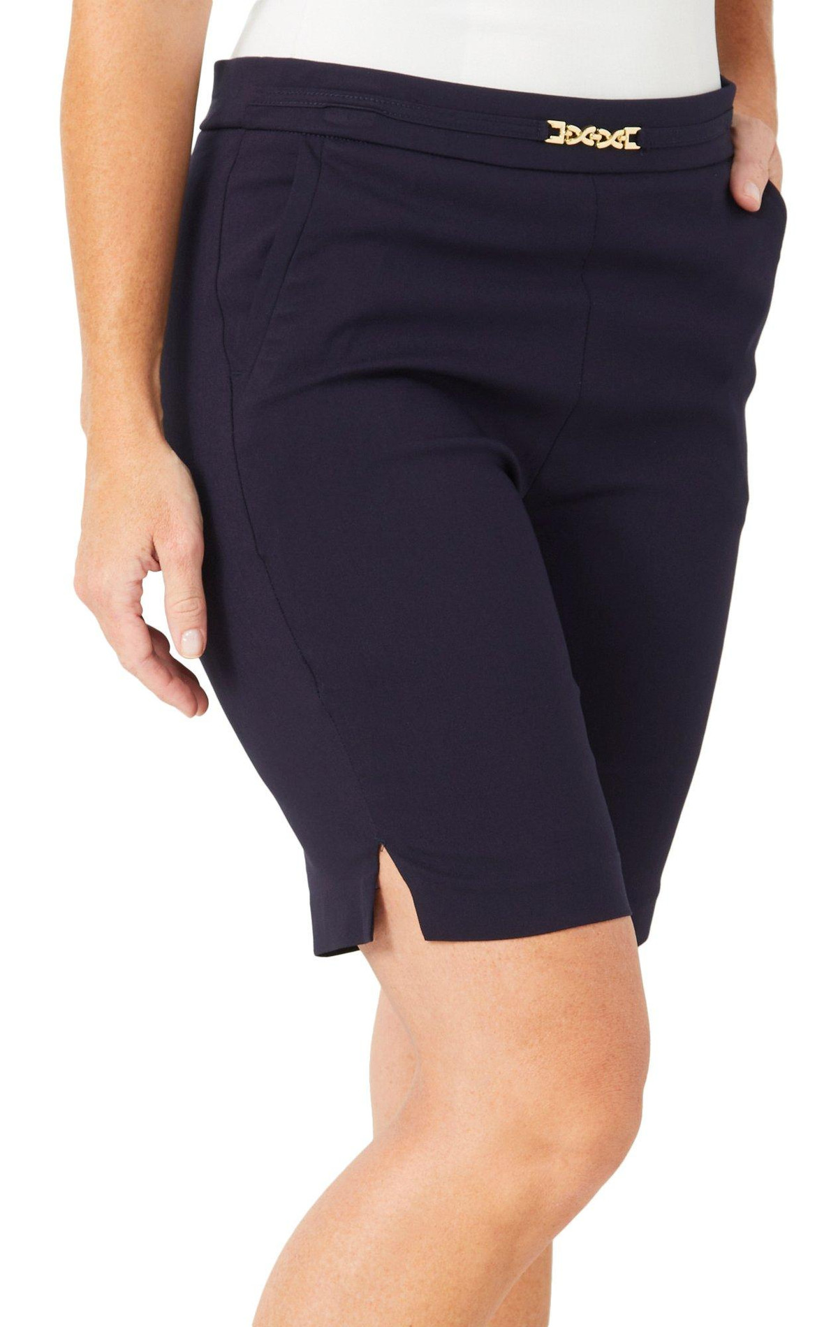 These shorts feature a solid color design on lightweight stretch fabric, a flat front with decorative chain detail on waistband, an elastic waist, and a classic fit. The inseam measures approximately 9 in. Fabrication