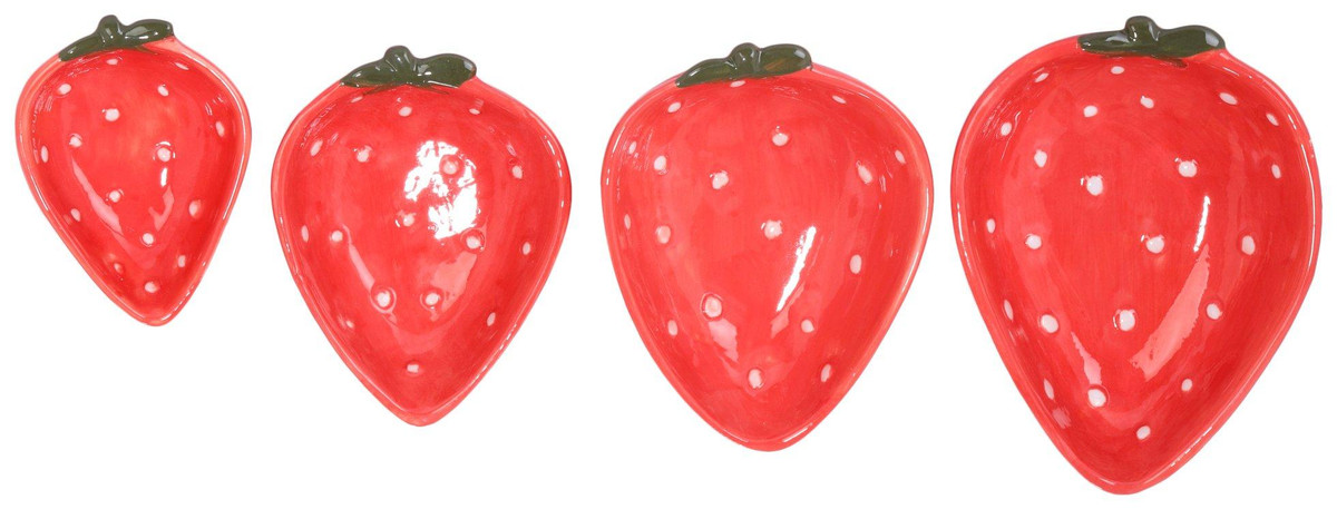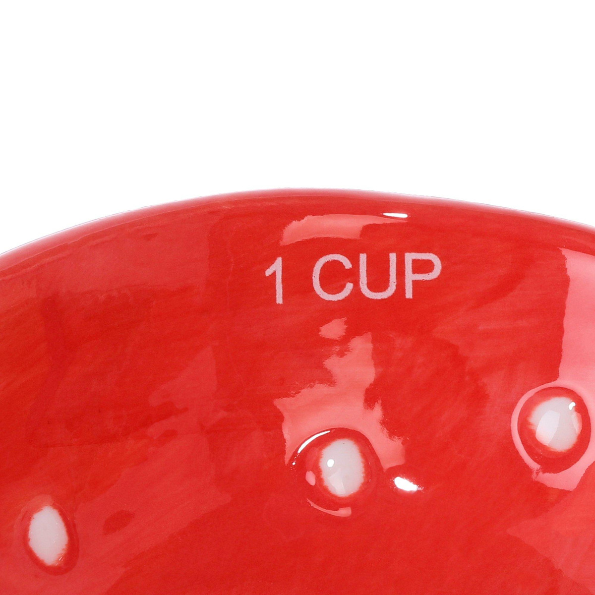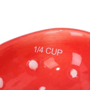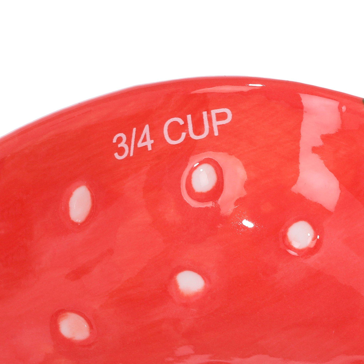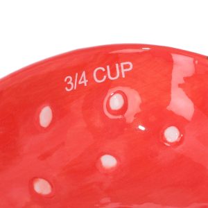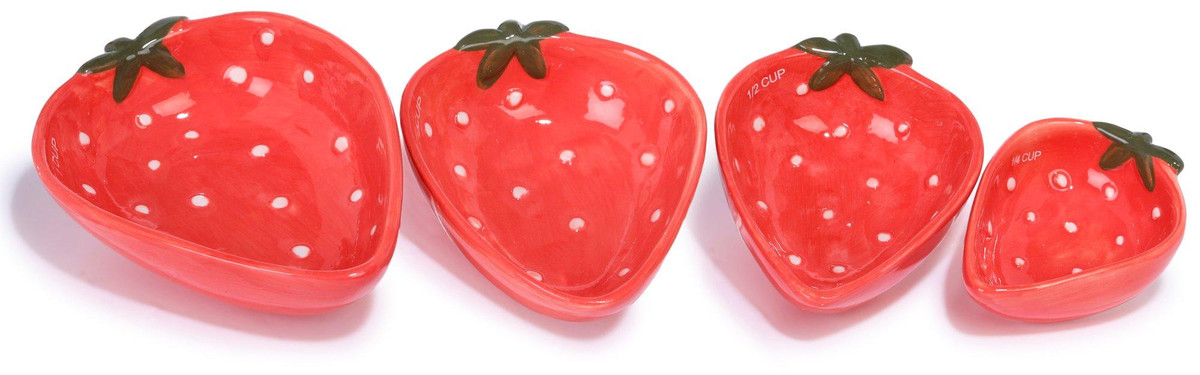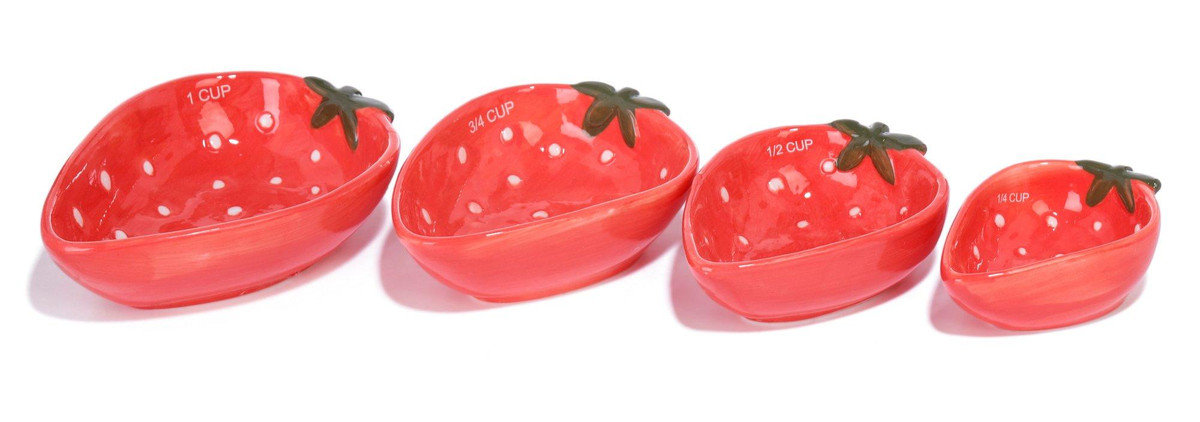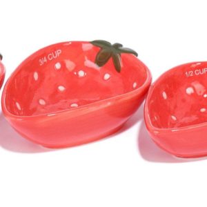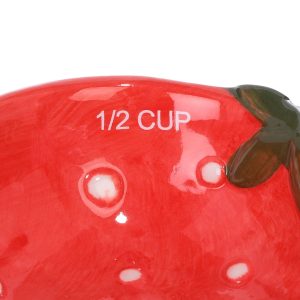 Add a touch of whimsy to your kitchen with this 4-pack of Strawberry Shaped Stoneware Measuring Cups. Hand-painted with intricate details, these charming cups come in assorted sizes to meet all your baking and cooking needs. Crafted from durable stoneware, they offer both functionality and a playful aesthetic. Perfect for measuring ingredients with style, these cups are a delightful addition to any kitchen.
