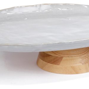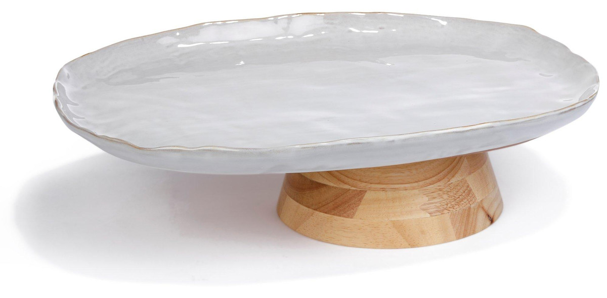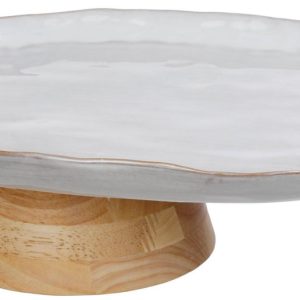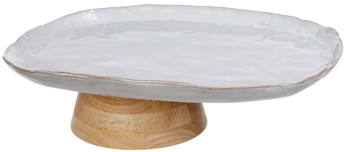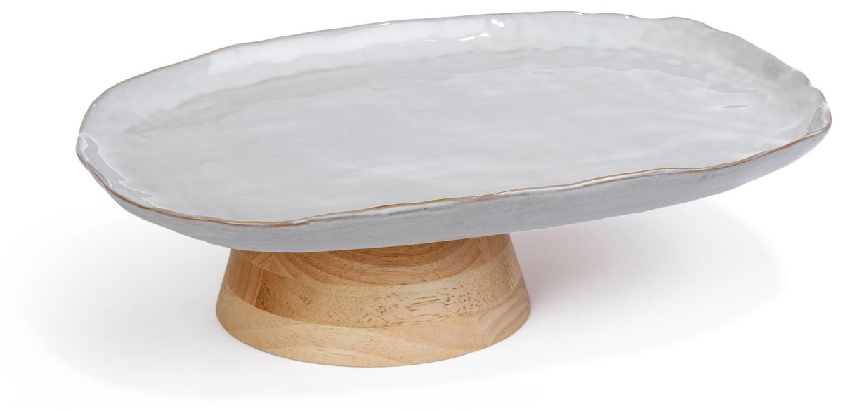 Elevate your home decor with this stunning Footed Stoneware Pedestal. Measuring 14 inches by 10 inches by 4 inches, it features a beautifully crafted acacia wood base and a reactive glaze exterior, adding a touch of elegance and sophistication to any space. Perfect for displaying your favorite items, this pedestal combines durability with timeless style.