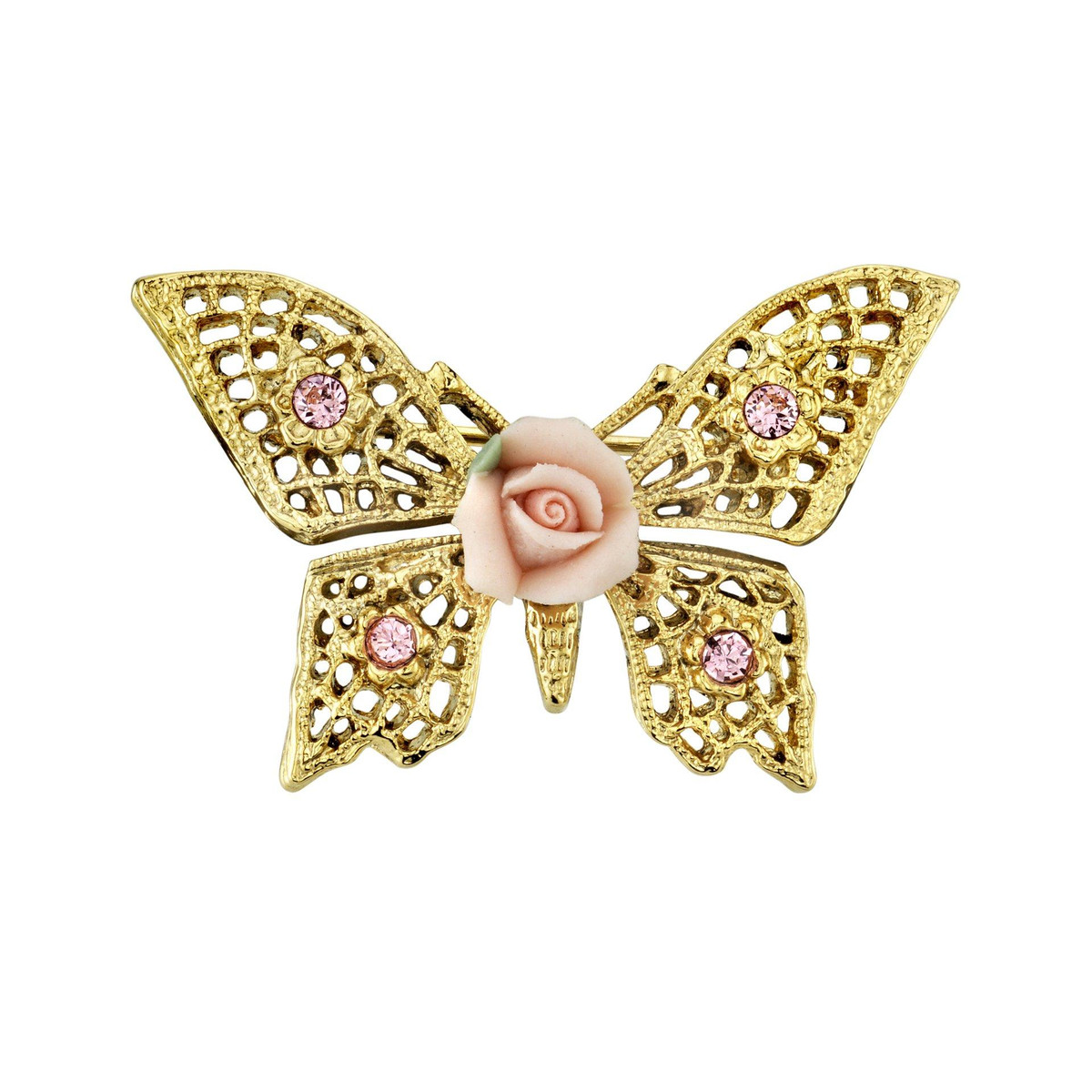 Embrace timeless elegance with this vintage gold tone filigree butterfly pin. Featuring a delicate porcelain rose center and light pink crystal accents on the wings, this romantic piece adds a touch of charm to any outfit. Perfect for those who appreciate intricate details and classic beauty, this pin is a must-have accessory for both special occasions and everyday wear. Length 1.4 in., width 22mm.