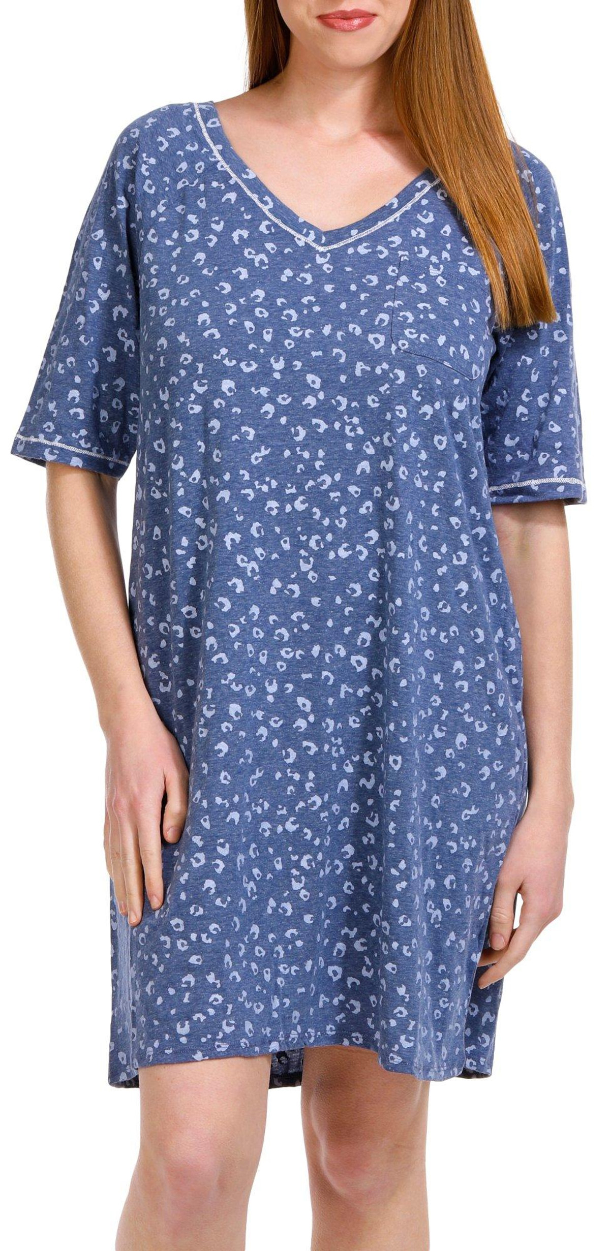 Unleash your wild side with our Short Sleeve Sleepshirt. This stylish sleepshirt features a bold animal print pattern and a flattering V-neckline, adding a touch of fun to your nighttime routine. The chest pocket provides a practical detail, while the soft fabric ensures a cozy and comfortable sleep. Perfect for lounging or sleeping, this sleepshirt combines playful design and comfort effortlessly. Fabrication is 73% polyester, 23% cotton, and 4% spandex.