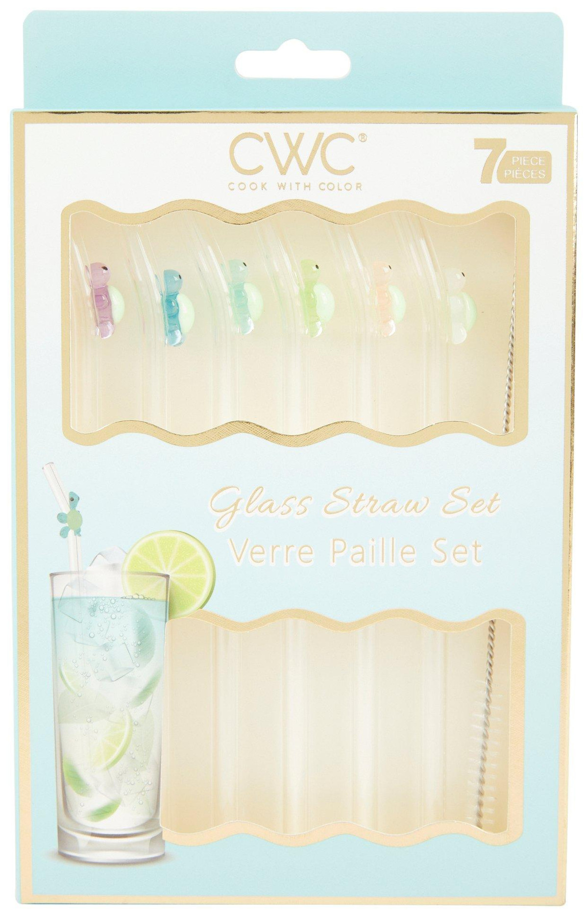 Sip sustainably with this 7-piece Glass Straw Set with little Turtle accents! Includes six reusable glass straws, each adorned with a cute accent, plus a cleaning brush for easy care. Measures approximately 8 in long.