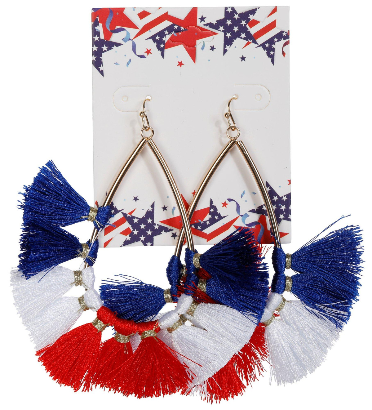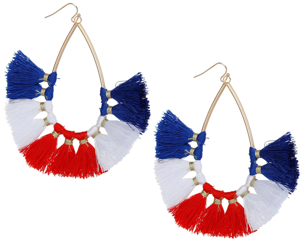 Celebrate bold style with these fanned earrings featuring a vibrant red, white and blue color palette. The dynamic design fans outward in a playful arrangement that adds movement and flair. With a graceful dangle, these statement earrings bring a festive and confident accent to your look.What materials are used in these earrings? What inspired the design of these earrings?How can I style these earrings for different occasions?