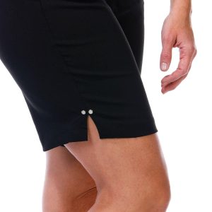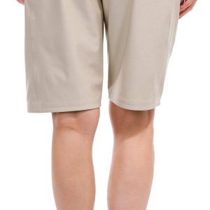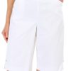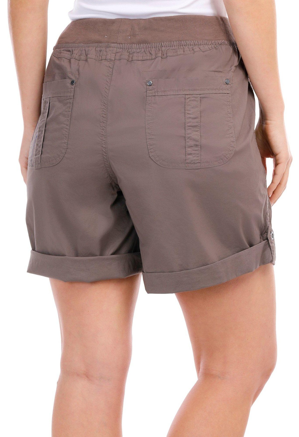 These pull-on Bermuda shorts feature a solid color design on lightweight cotton blend woven and knit fabrication, 2 front and back pockets, roll tab cuffed hemline, and a wide elastic ribbed waistband with adjustable drawstring for comfort fit. Inseam measures approximately 6 in. Outseam measures approximately 17 inches from waistband to hemline. Fabrication 98% cotton, 2% spandex.