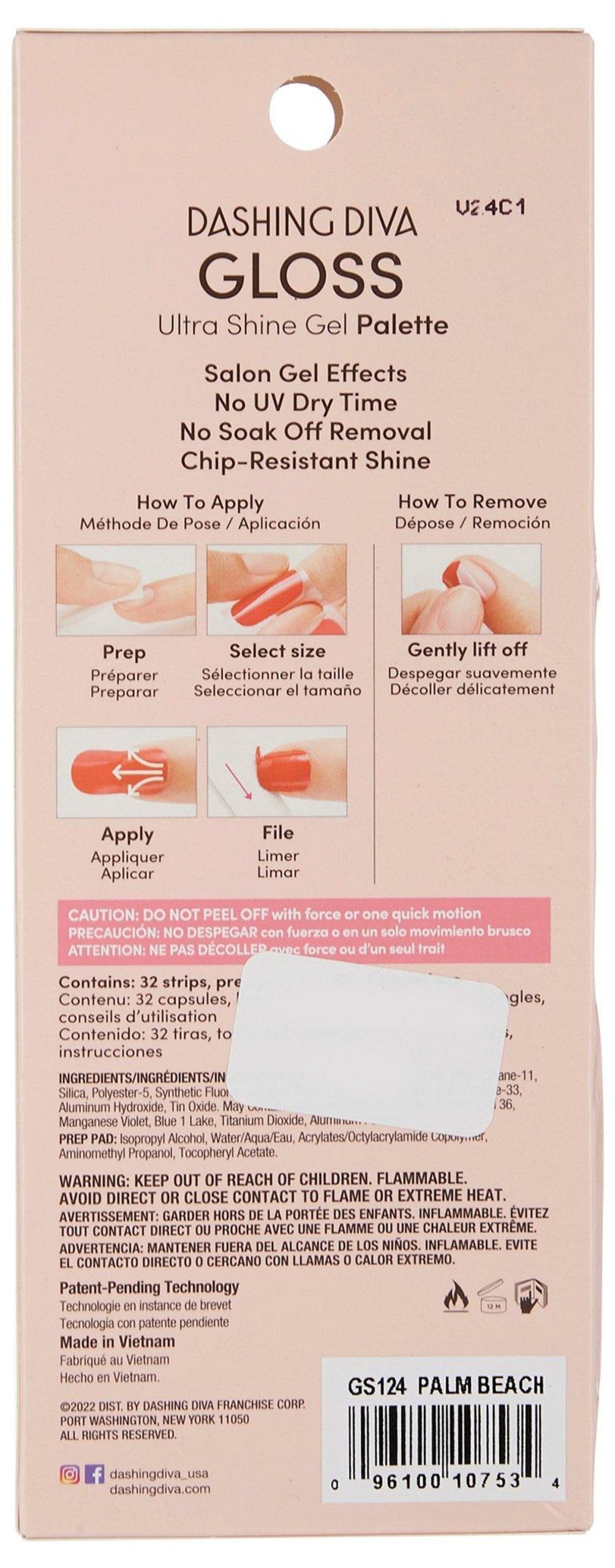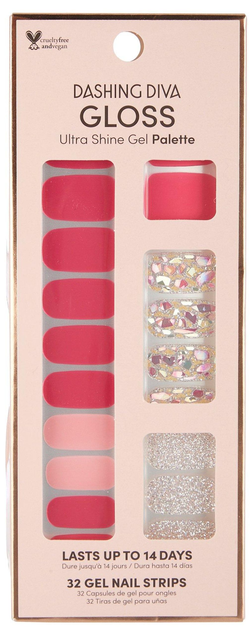 Dashing Diva Ultra Shine Gel Palette 32 Gel Nail Strips features 32 gloss gel nail strips in a variety of designs, no UV dry tmie, salon gel effects, no soak off removal, chip-resistant shine, and lasts up to 14 days. Best used within 12 months of opening. Contains 32 gel nail strips, prep pad, nail file, and instructions.