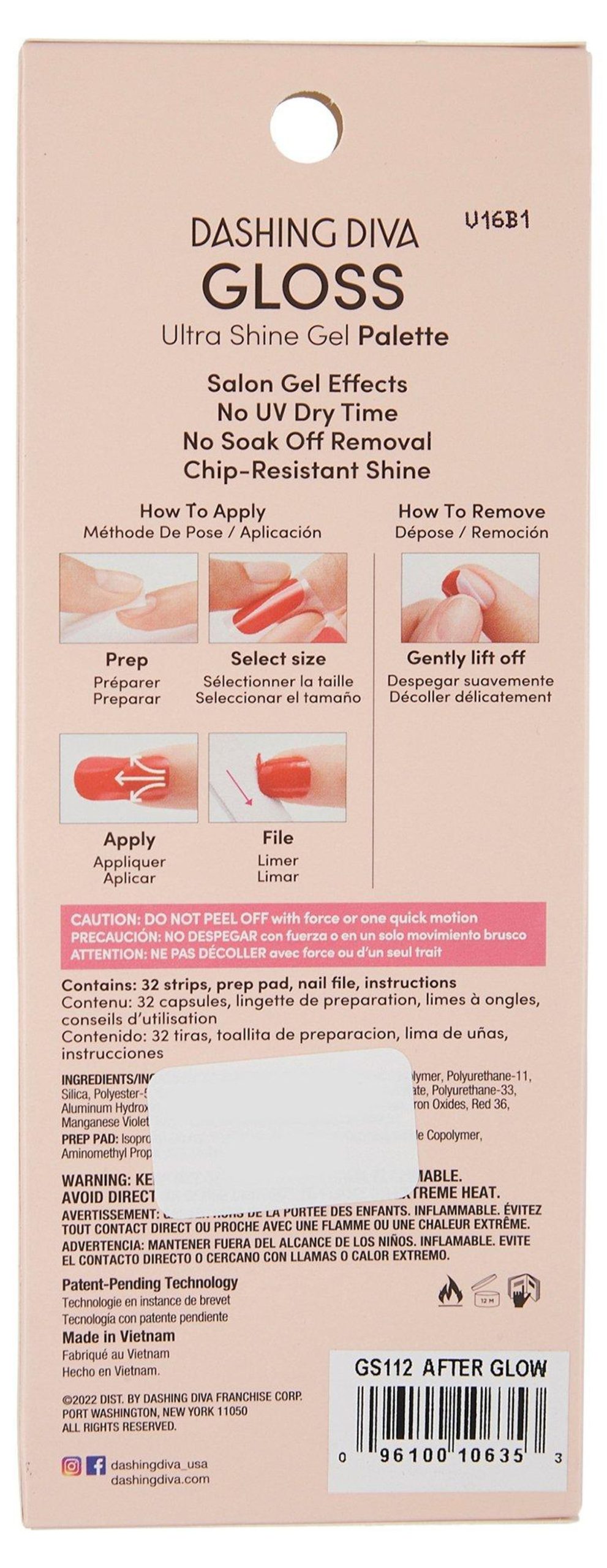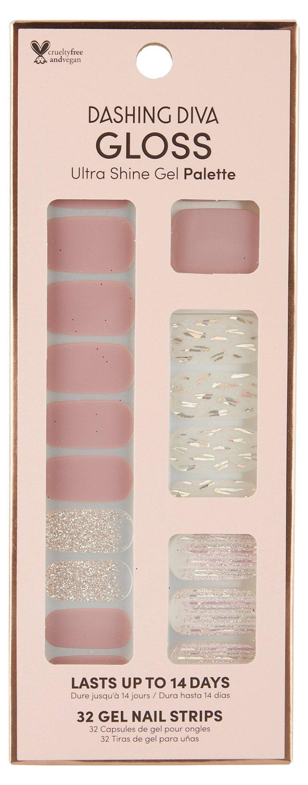 Dashing Diva Ultra Shine Gel Palette 32 Gel Nail Strips features 32 gloss gel nail strips in a variety of designs, no UV dry time, salon gel effects, no soak off removal, chip-resistant shine, and lasts up to 14 days. Best used within 12 months of opening. Contains 32 gel nail strips, prep pad, nail file, and instructions.