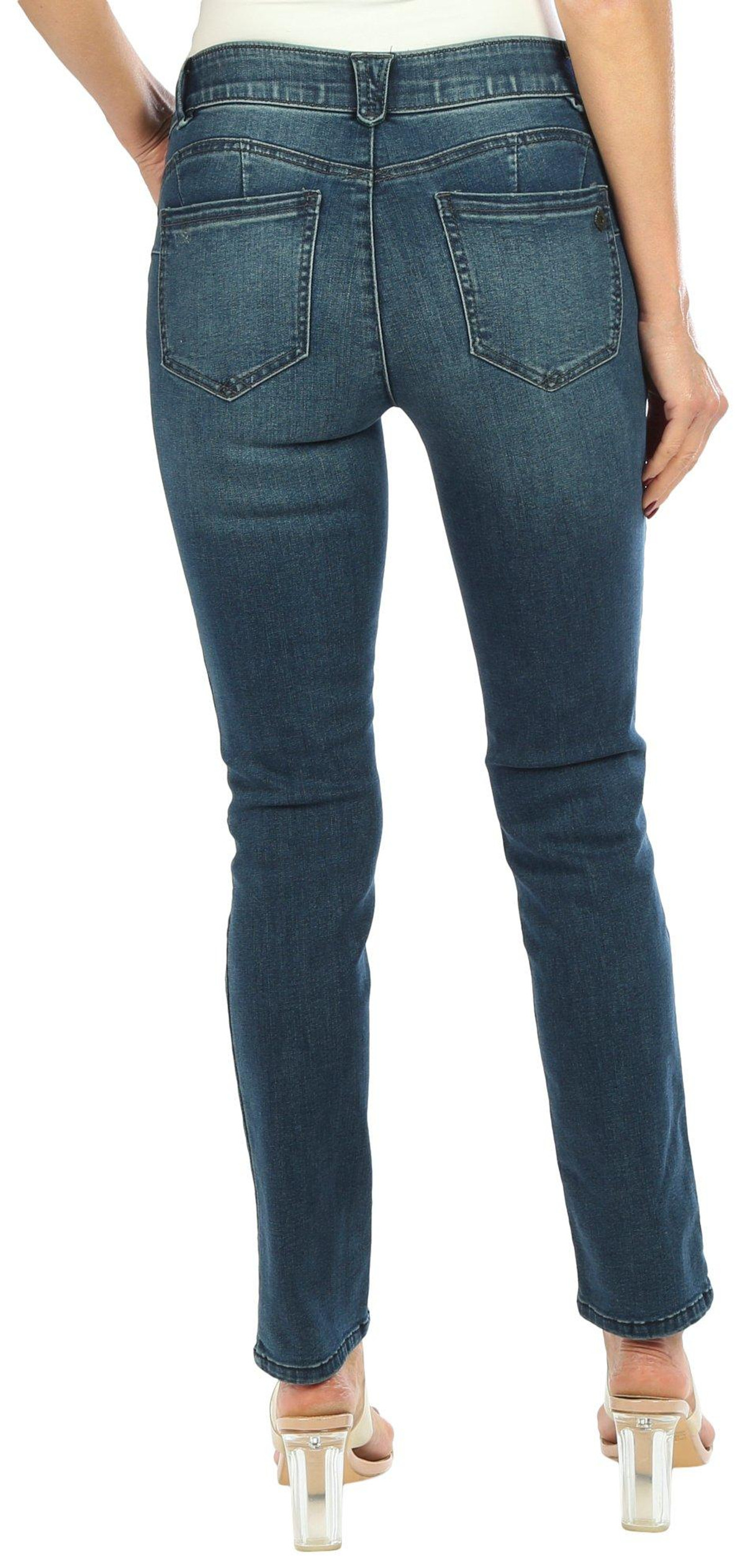 These jeans feature a solid color design on lightweight stretch denim fabric, a stretch waistband, built-in Ab-technology, one-button and zipper closure, five pocket styling, and subtle distressing. The inseam measures approximately 28 in. Fabrication 54% cotton, 25% rayon, 18% polyester, 1% spandex.