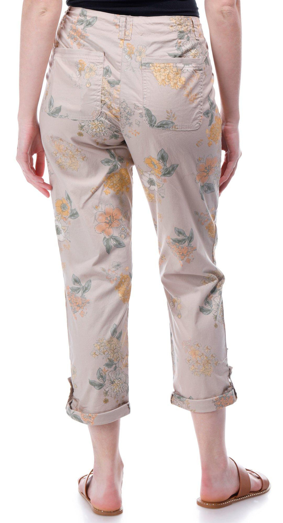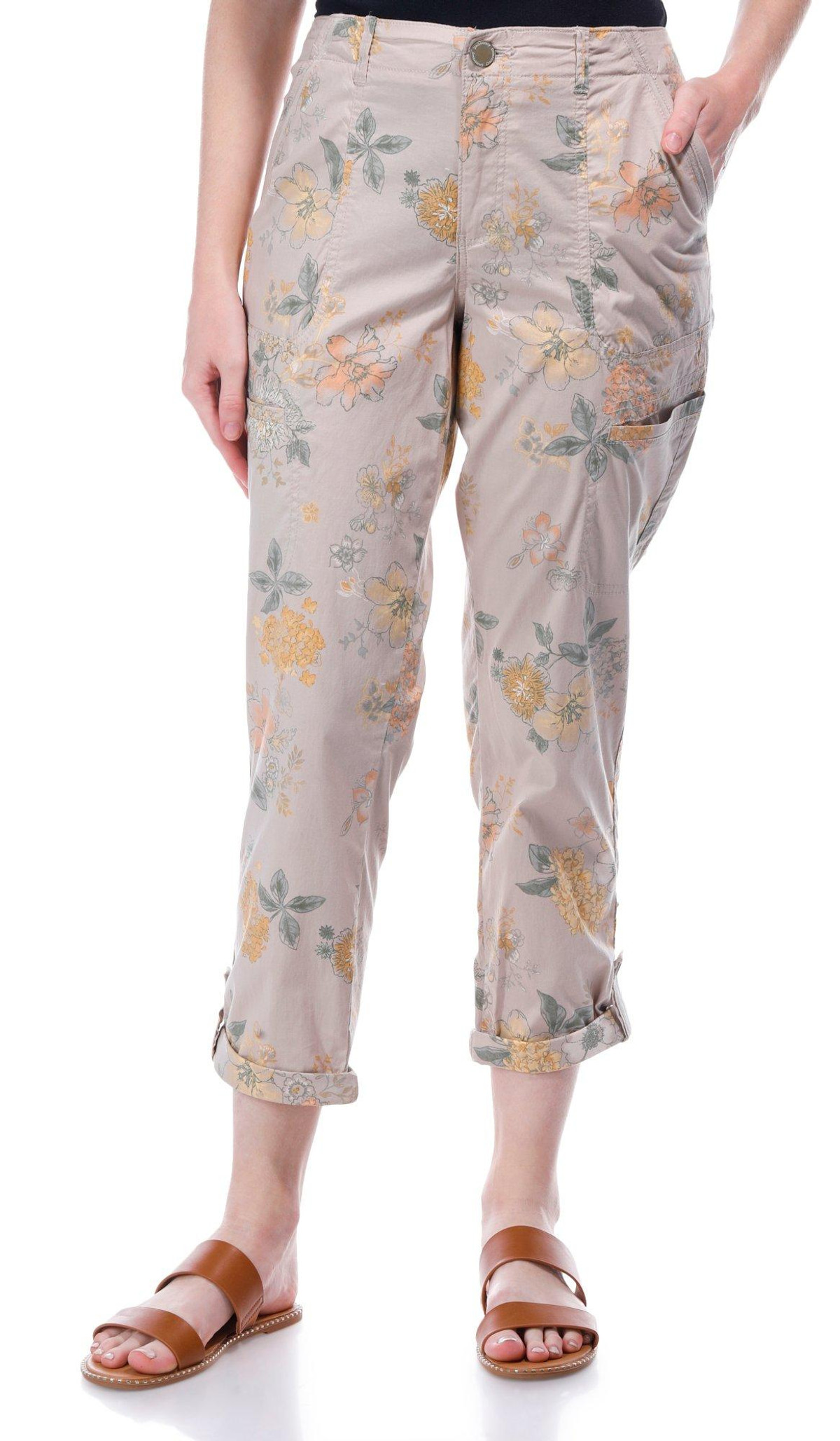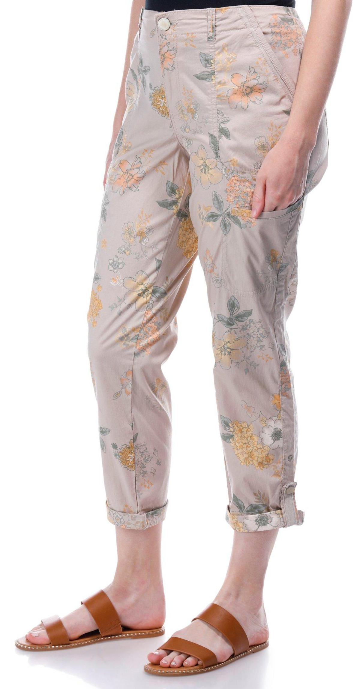 These stylish utility pants are exactly what your wardrobe needs to keep the adventure going! They feature a stylish all-over floral-style print pattern, button and zipper fly closure, buttoned roll-cuff hems, double front and rear pockets, and 2 additional utility pockets to keep your belongings safe on the go! Inseam measures approximately 25 in. Fabrication is 98% cotton and 2% spandex.