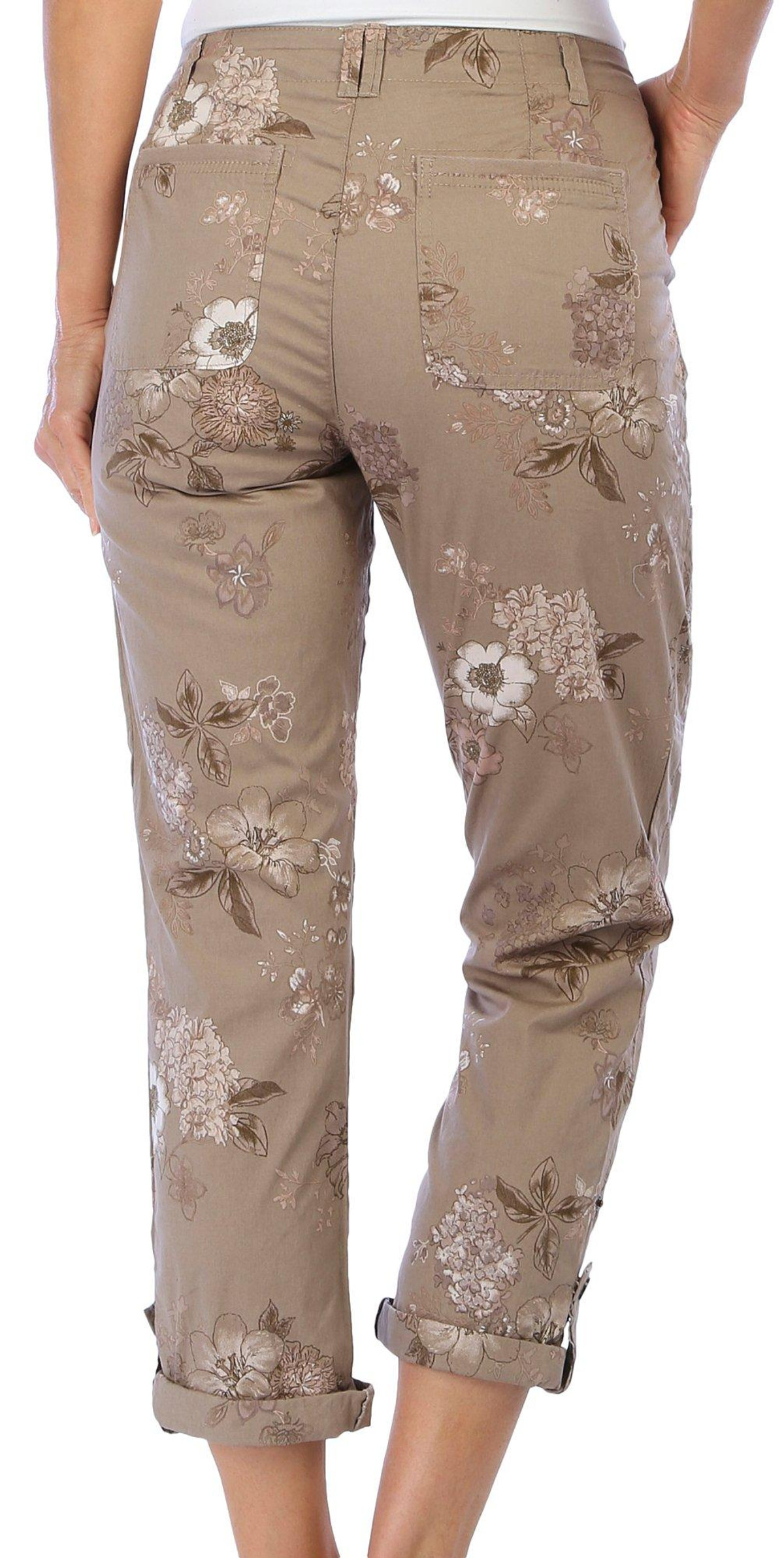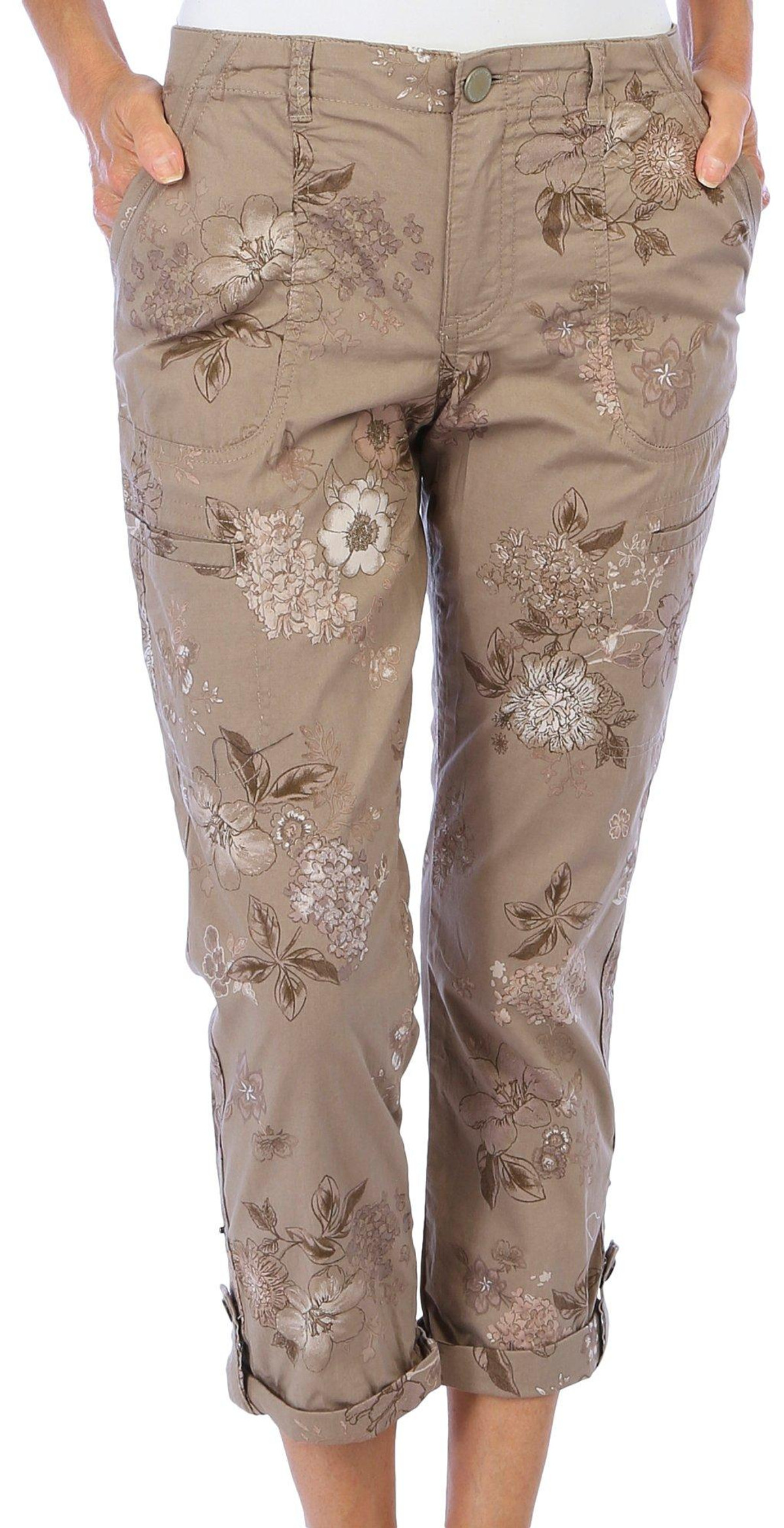 These stylish utility pants by Democracy are exactly what your wardrobe needs to keep the adventure going! They feature a stylish all-over floral style print pattern, button and zipper fly closure, buttoned roll-cuff hems, double front and rear pockets, and 2 additional utility pockets to keep your belongings safe on the go! Inseam measures approximately 25 in. Fabrication is 97% cotton and 3% spandex.